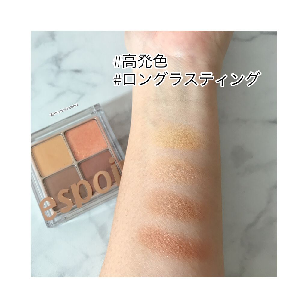 espoirREALQUADPALETTEORENGEFEVERリアルアイパレットがあまりにも気に入ったのでこっちの4色パレットも購入🎨💕見た目はクリアパケにブランドロゴがプリントされていてシンプルなデザイン💫カラーはイエロー×オレンジっぽい...