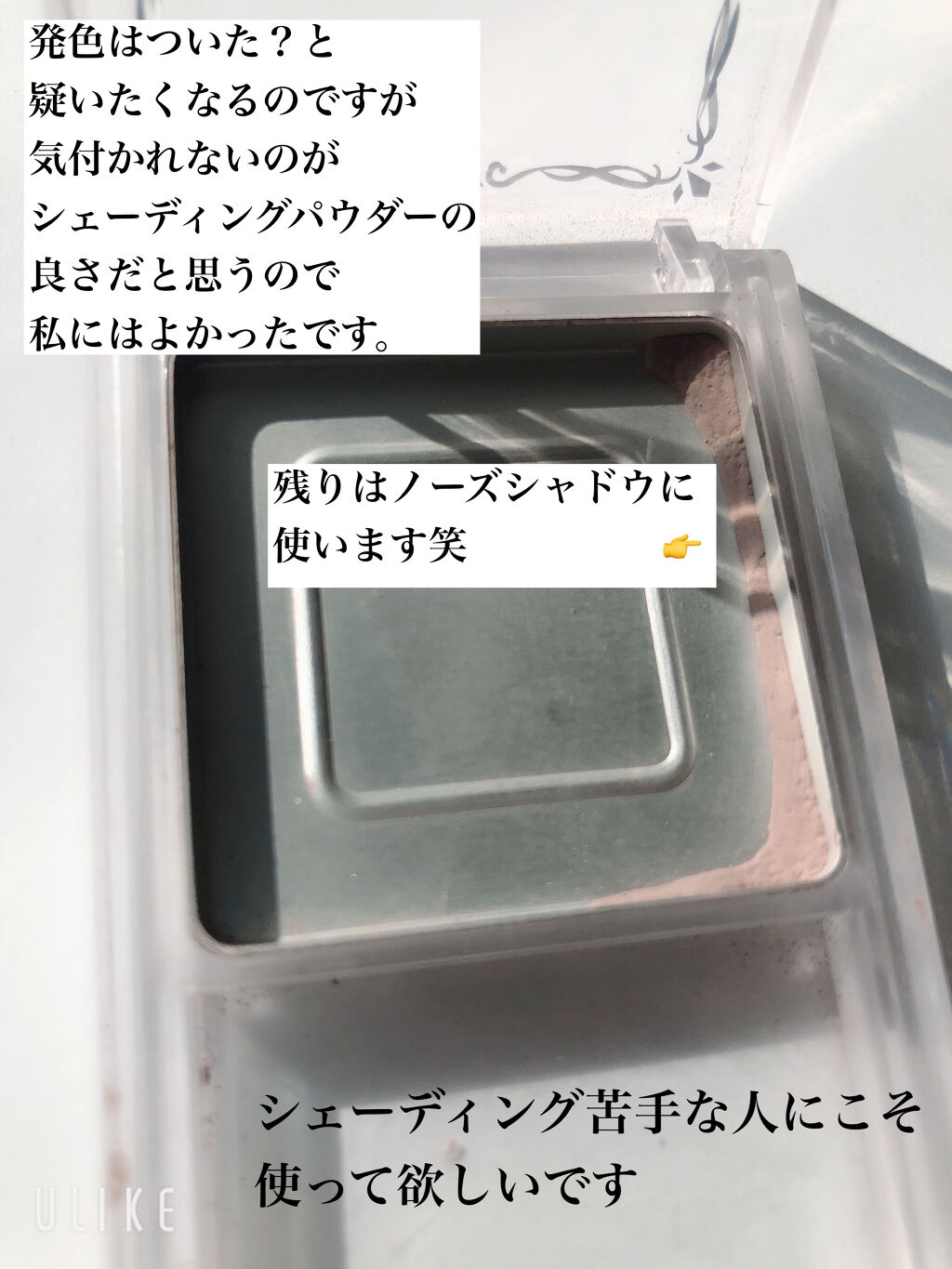 フェイスラインにキレイな立体感を出して、小顔に仕上げる、シェーディングパウダー 青みのあるグレー系のブラウンで、肌色にも合うし、ブルベカラー好きなので他のコスメとの相性も良い◎ 付属の平ブラシが、フェイスラインに塗りやすくて、自然な影が入り小顔に見える☺︎