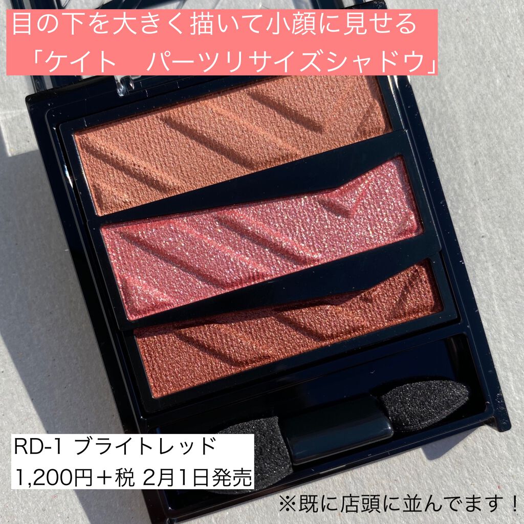 - 研究所のデータに基づいてKATEが提案するのは、「アイシャドウで小顔に見せる」という考え方。アイシャドウで目を下に大きく描くと頬の余白が埋まり、美しい小顔に見える、「小顔リメイクシャドウ」を発売します。 目を下に大きく見せるために計算された、異なる質感の3色で簡単に小顔メイクと目もとが際立つメイクを楽しめます。
