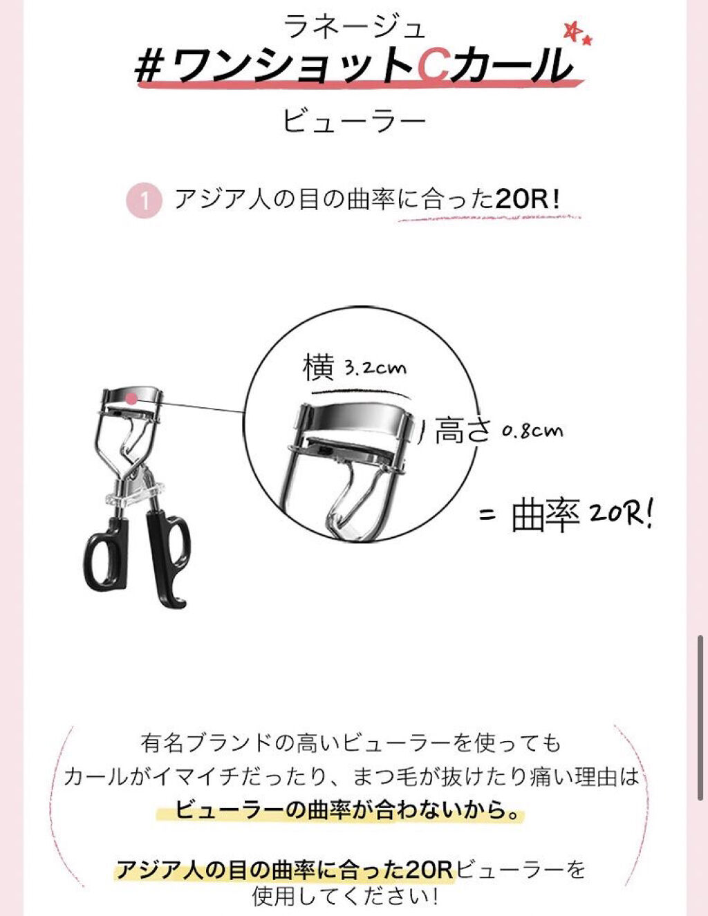 - アジア人の目の曲率に合った20Rと、スプリングの付いたハンドルで、ばっちりCカールまつ毛が作れるビューラー。
