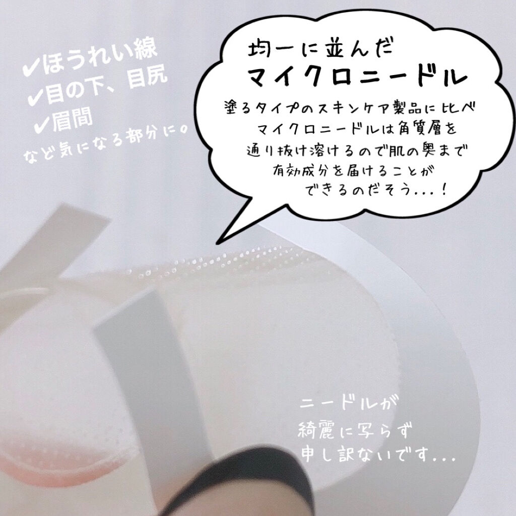 マイクロニードルパッチはお肌に潤いを与えるヒアルロン酸とヒト幹細胞培養エキスを角質層まで浸透させるためにニードル状に加工したもの✨ シカは直径1.5cmくらいの円状のパッチ。 ニキビなどのトラブルにアプローチしてくれる! 翌朝貼ったところがふっくらした印象に!