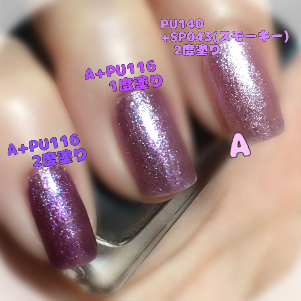 💜大人気のPU116💜宇宙感があって、夜ネイルやパーティー的なネイルに✨すごーく綺麗でお洒落なカラー💜今日はパープル隊の新人お披露目会だったので爪もパープルにヽ(´▽`)/1度塗りでは透け感があって綺麗だけど、少しムラになるので、塗りかけを入...