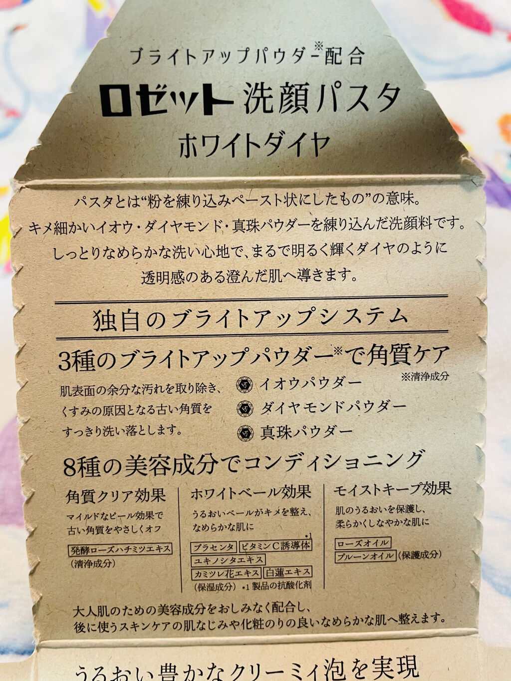 - <ロゼット洗顔パスタ ホワイトダイヤ> 水、ミリスチン酸、ステアリン酸、グリセリン、パルミチン酸、水酸化K、ジグリセリン、ラウリン酸、ラウラミドDEA、メチルグルセス-10、コカミドプロピルベタイン、ラウロイルメチルタウリンNa、イオウ、ダイヤモンド末、パール、グルコノバクター/ハチミツ発酵液、プラセンタエキス、アスコルビン酸硫酸2Na、ユキノシタエキス、カミツレ花エキス、乳酸桿菌/ハス種子発酵液、ダマスクバラ花油、プルーン種子油、BG、コレステロール、ヤシ脂肪酸K、ココイルグリシンK、ステアリン酸PEG-45、セテス-25、トリセテス-5リン酸、ステアリン酸グリセリル(SE)、ヒドロキシプロピルデンプン、(ジフェニルジメチコン/ビニルジフェニルジメチコン/シルセスキオキサン)クロスポリマー、亜硫酸Na、EDTA-4Na、香料
