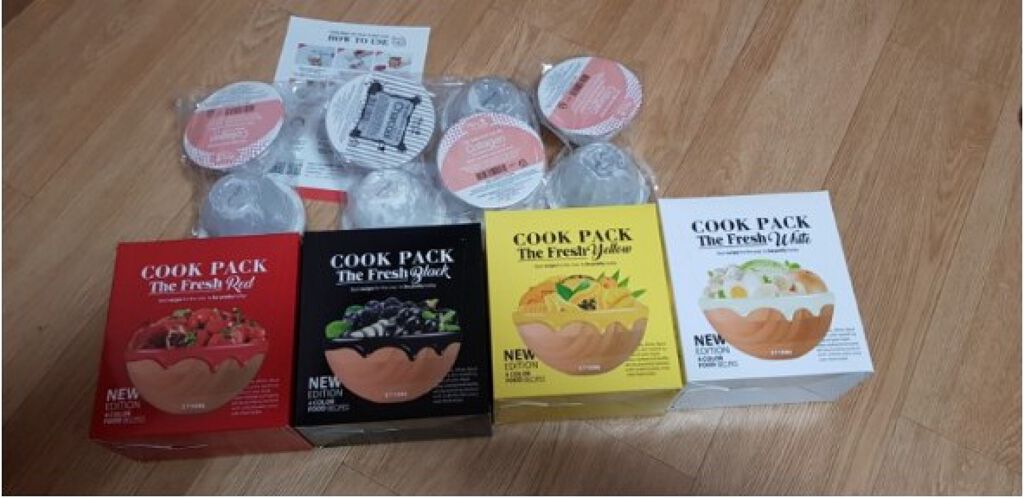 モデリングパック家でするのは難しいけどそれを可能にするイッタン!クックパックは総4種類でブラック、ホワイト、アイス、レッドで構成されていて私がもらった商品はその中のホワイトです:)容器とスパチュラーが入っていて他に道具が必要ないという事が長所...