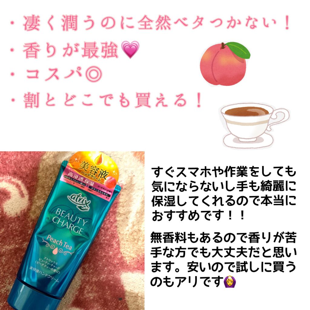 ❁.˚‧º‧‧º·˚.❁ 手に塗る美容液❁.˚‧º‧‧º·˚.❁。アトリックスビューティーチャージピーチティーの香りを買ったよ◡̈✩*˚₊‧ੈ✩おすすめポイントੈ✩‧₊˚*⋆浸透型ヒアルロン酸EX(保湿成分:ヒアルロン酸+グリセリン誘導体...