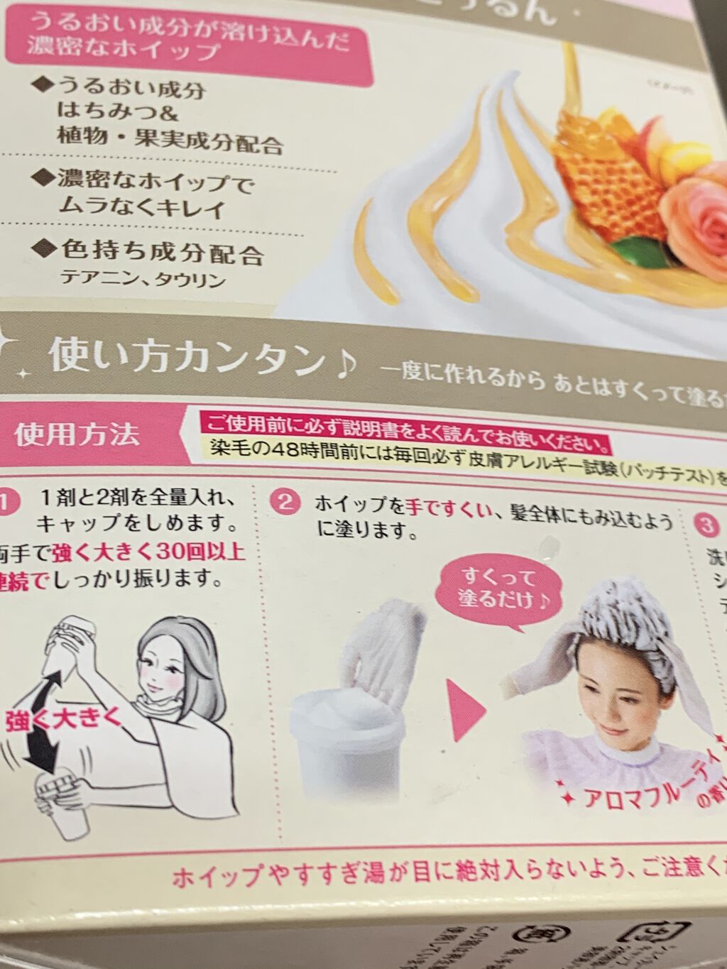 - <医薬部外品> ●髪にうれしい3つの成分が「うるおい つややかな髪色」に導きます うるおい成分(はちみつ&植物・果実成分) 色持ち成分(W アミノ酸=テアニン・タウリン) 毛髪保護成分(ポリ塩化ジメチルジメチレンピロリジニウム液) ● 使い方カンタン。シェイカー容器で一度にホイップを作れるから、あとはすくって塗るだけ ●もっちり濃密なホイップで、ムラになりにくくキレイに染まる ● 全18色のカラーバリエーション 「ナチュラルライン」と「ニュアンスライン」、2つのカラーラインナップから選べます ● アフターカラー美容液つき パッケージ内容:1剤、5剤、シェイカー容器、手袋、使用説明書、アフターカラー美容液