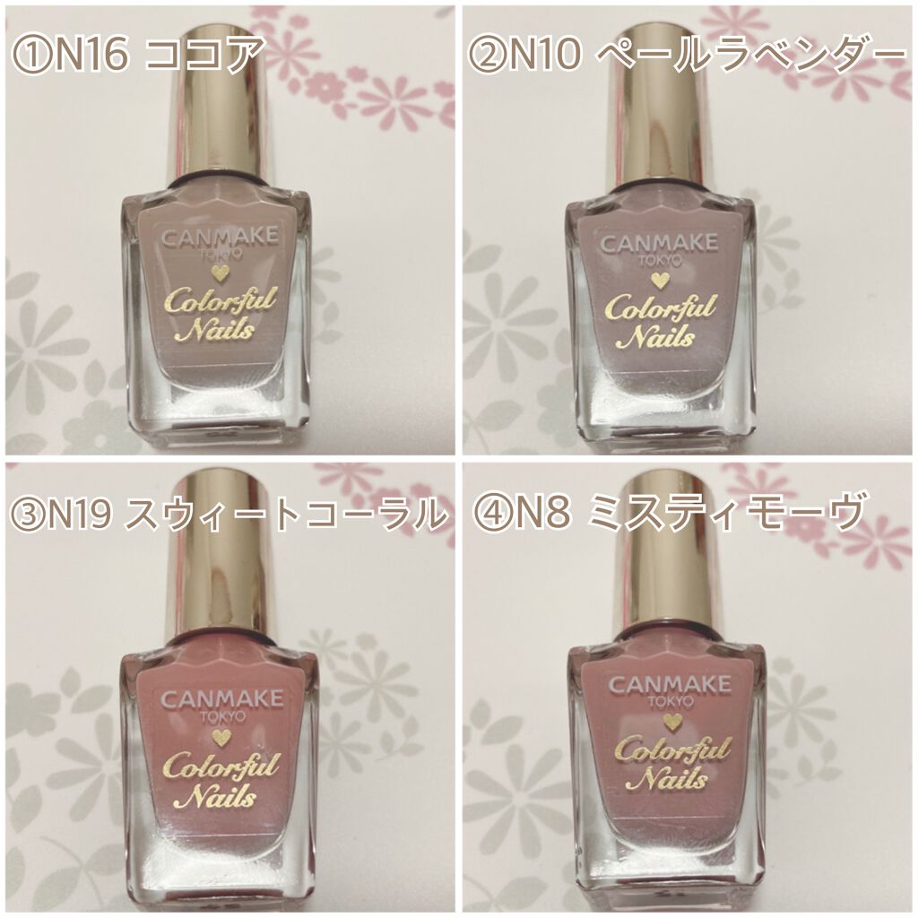 CANMAKE★色比較#キャンメイク#カラフルネイルズ4色の色を比較してみました✂︎①N16ココア優しいベージュ系オフィスネイルにピッタリ◎1度塗っただけでも発色がいい◎2度塗りすると、少し黄色味が強くなるから肌色がくすむ人がいるかも△②N1...