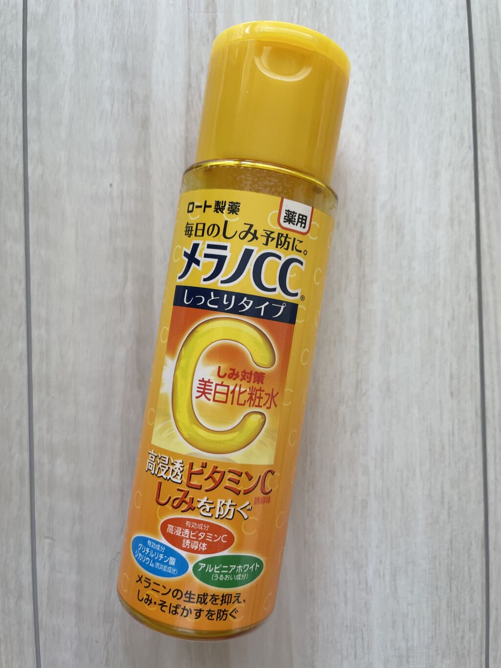 - 「メラノCC 薬用しみ対策 美白化粧水 しっとりタイプ」は、顔全体にうるおいを与えながら、しみ対策できる薬用美白化粧水。 美白有効成分の高浸透ビタミンC誘導体*1が角質層のすみずみまで浸透し、メラニンの生成を抑え、しみ・そばかすを防ぎ、透明感のある肌へと導きます。 また、抗炎症成分*2と3種のうるおい成分*3を配合。ニキビ痕が気になる肌にもうるおいを与え、肌を整えます。 さわやかな柑橘系の香りです。 *1:3-O-エチルアスコルビン酸 *2:グリチルリチン酸ジカリウム *3:アルピニアホワイト、レモンエキス、グレープフルーツエキス