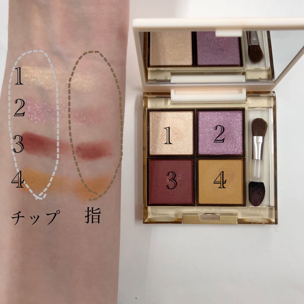 - 色も、質感も、きらめきも。毎日お気に入りの目元を作れる4 色パレットシャドウ 1.様々な色や質感、きらめきを組み合わせて楽しめます。 2.重ねても美しく濁りのないクリアな発色です。 3.まぶたにピタッと密着して粉飛びやヨレを防ぐフィットオイル*1配合。 4.デリケートなまぶたのためのスクワラン*2配合。 <デザイン> ・色調整しやすいオリジナルチップ&ブラシ しっかり発色させたいときにはチップ、ふんわりぼかしたいときにはブラシを。 お好みに合わせてお使いいただけます。 ・ 持ち運びに便利な鏡付き ・ この冬だけの限定デザイン パーティーの華やかさを想起させるカジュアルアートをあしらった開放感あふれるポジティブなデザインです。 *1 リンゴ酸ジイソステアリル *2 保湿成分