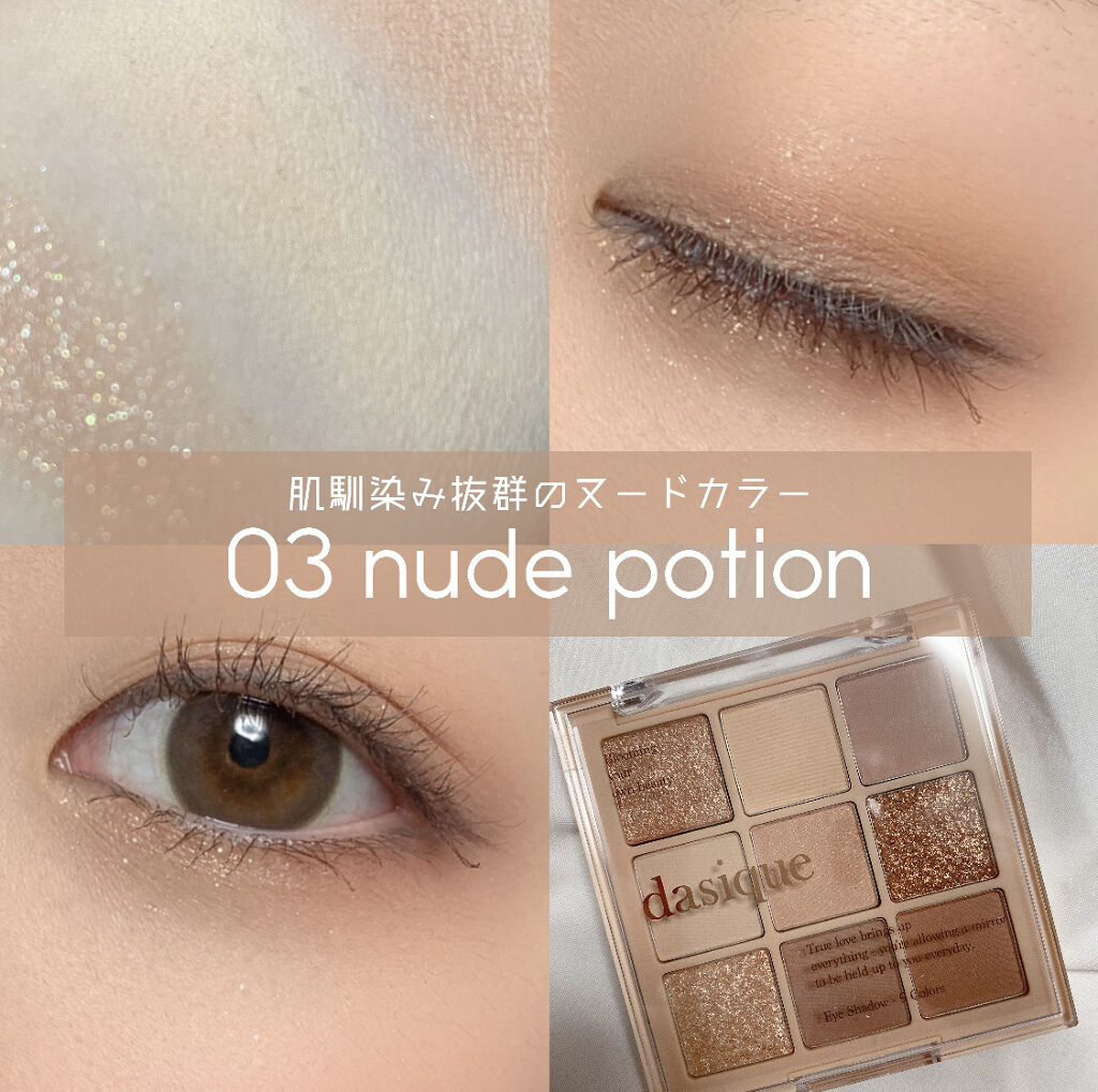 dasiqueシャドウパレット03ヌードポーション誰でも使いやすい色味のベージュです!ヌードカラーが盛り込まれていて、ナチュラルメイクにはもってこいです☺️目の周りの陰影を上手く作りやすく、濃すぎて失敗した!ということが起こりにくいのがこのパ...