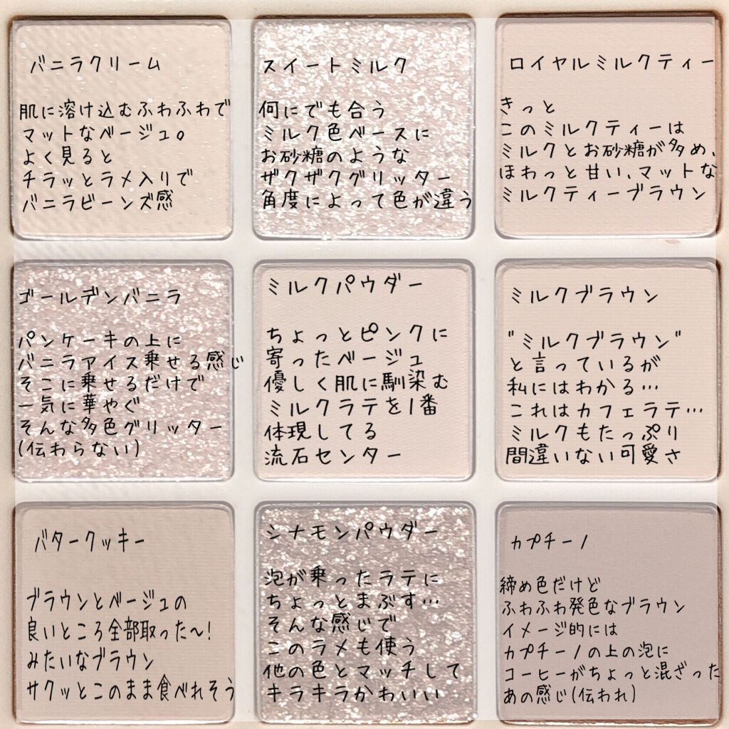 粉質も柔らかく、マットのカラーに関しては発色も淡いから、重ね塗りすればするほど深みが増していき、濃淡も調節しやすい🥰 ラメもキラッキラで可愛いし、組み合わせも自由自在で思いのままにメイクできる万能パレットです☺︎ 一押しはミルクラテ!陰影メイクが簡単にできます❤️🔥