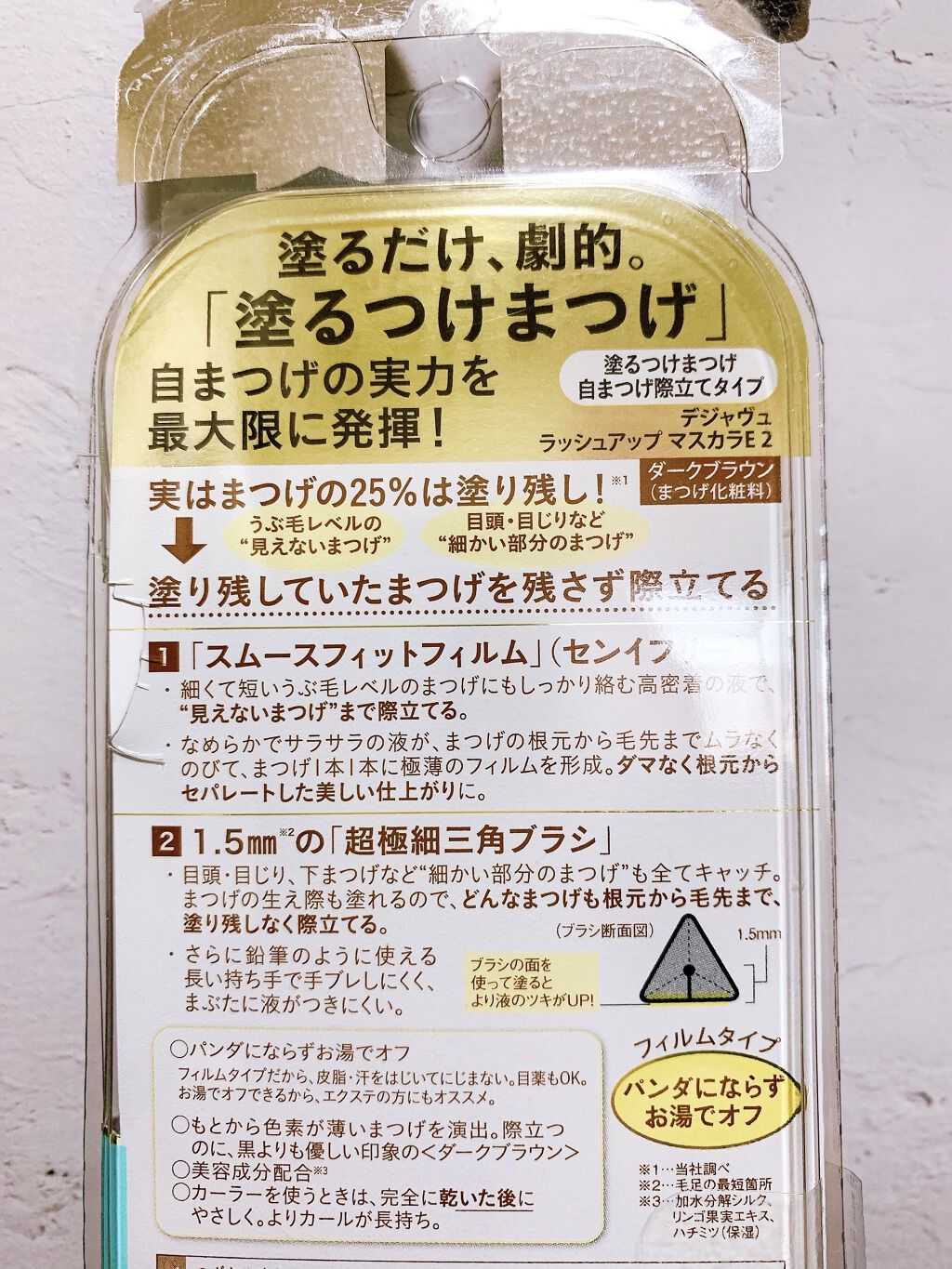 - ロングでもボリュームでもない、「自まつげを際立てる」という新発想 “見えないまつげ”も1本残らず際立てて、目ヂカラを最大限に引き出す 1.うぶ毛レベルの“見えないまつげ”も際立てる「高密着フィルム」 2.あらゆるまつげも1本残らず際立てる「超極細三角ブラシ」