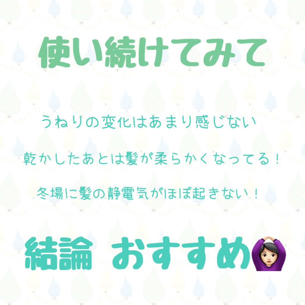 | ドライヤーで乾かしてもまとまりが良かったです。髪はしっとりまとまる感じだけど、根元はふんわり。 | 詳細を見る | ||