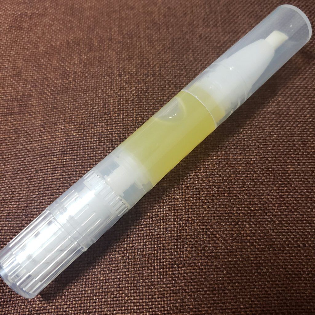 持ち歩き用で使っています。ペンのような形で先は刷毛になっています。 スキマ時間にササッと塗れて、オイルがサラサラではないので垂れたりすることもありません。 黄色の方は甘皮ケアオイルで、こちらはお家で使っています。