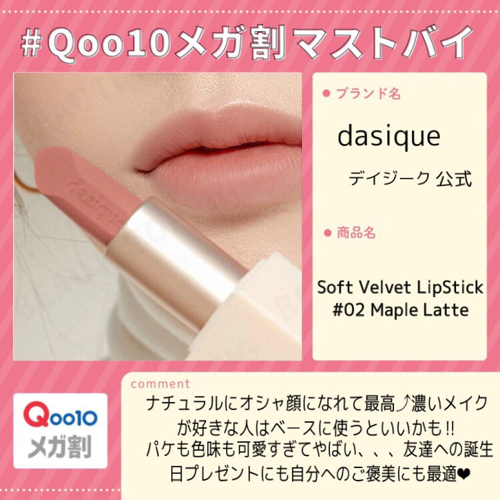 dasique★ソフトベルベットリップスティック02メープルラテ高級感あるデザインです!磁石で閉まるので閉めやすかったです!色もかわいいブラウンぽいカラーでイエベさんも、使いやすいです乾燥しにくいテクスチャーでマットリップ苦手な方でも使えます...