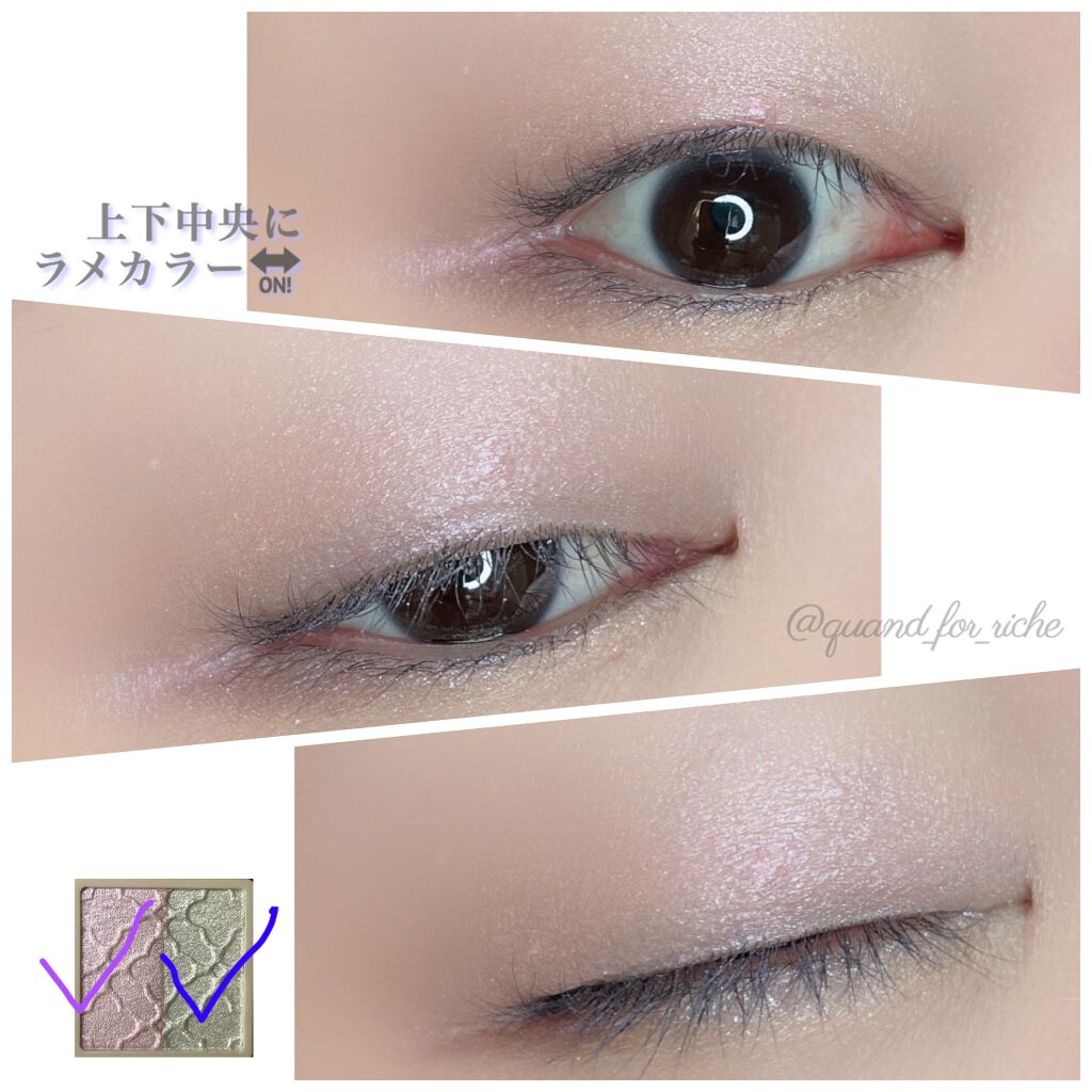 - ● 異なる色と質感を同時に楽しめる印象自在の 2 in1 アイカラーです。 A ニュアンスカラ ー : 繊細なパールがまぶたにしっとりと密着。 透明感の高いクリアな発色とツヤを叶えます。 アイカラー下地としてもご使用いただけます。 B シャイニーダズルカラー: シルバーコーティングした高輝度な 大粒パールが目もとを演出します。 ● まぶたへの密着性が高いため、色と輝きが長時間続きます。 ● 使い方次第で、上品にも大胆にも様々な表情を演出します。 ● 美容液成分配合。うるおいをあたえ、乾燥・あれを防ぎます。 ● 無香料