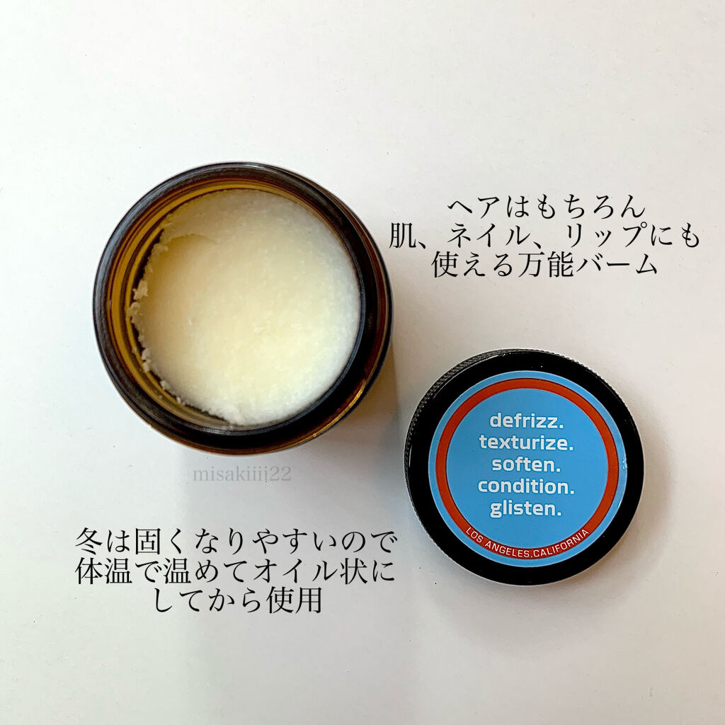 - ヘアスタイリングはもちろん、髪・肌・リップ・ネイルなど全身に潤いを与え保湿ケアできる、天然由来原料だけで作られたマルチバーム。 柑橘系の爽やかな香り。コンパクトなサイズで持ち運びにも便利。 外出先でもこれ一つでヘアスタイリングから、あらゆるケアに活躍。