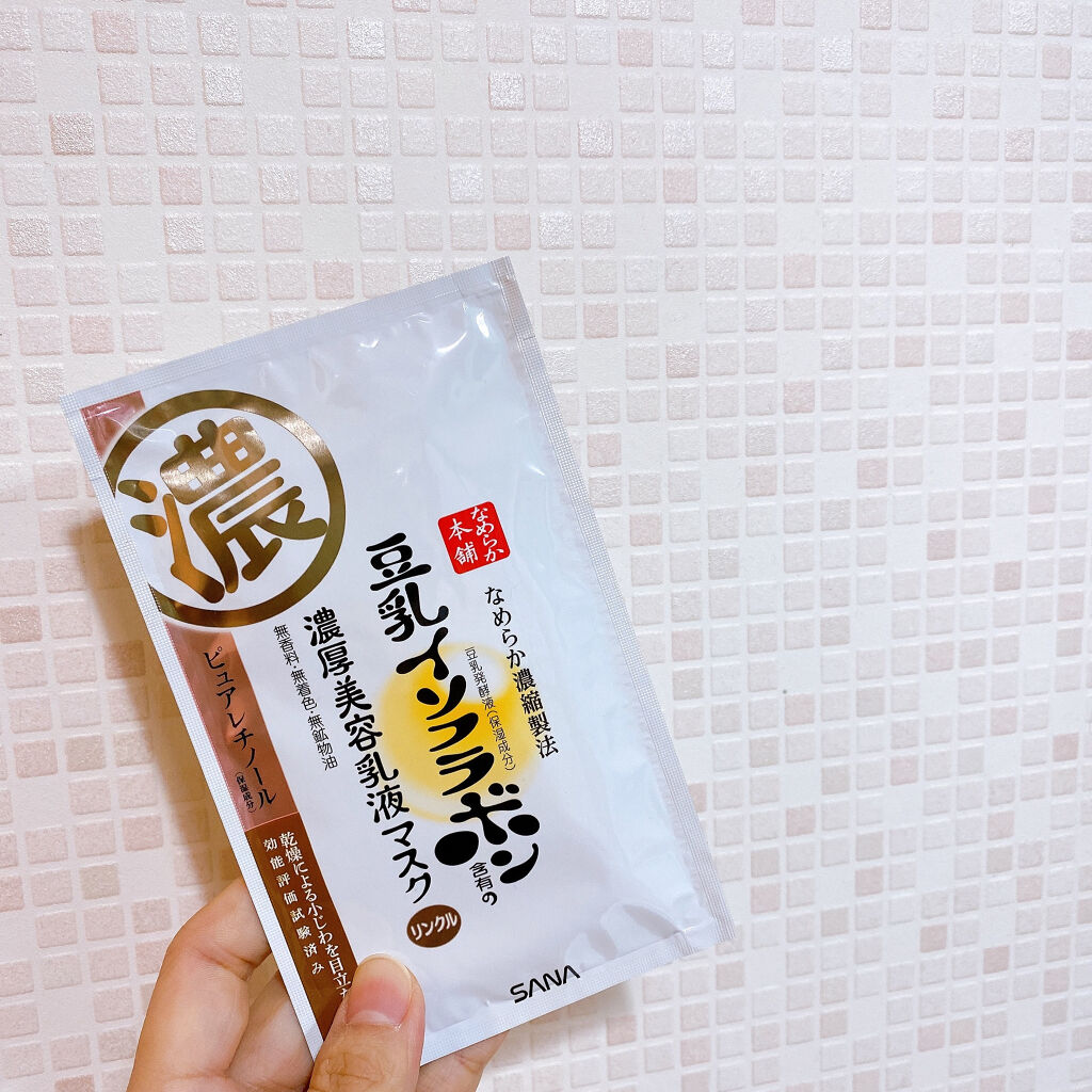 肌もっちりぷるぷる 《なめらか本舗》豆乳イソフラボンリンクルシートマスクN 20枚入り 大容量でとても使いやすかったパックです。ほどよい厚さのシートで5分~10分のお手軽マスク。 ピュアレチノール入りなので主に寝る前に使用していました。