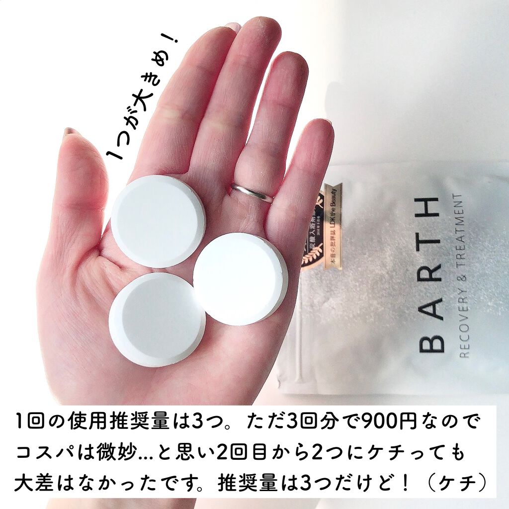 - 【医薬部外品】 ポイント① 溶け込む重炭酸イオン BARTH は独自の製造技術で、重曹とクエン酸の反応を科学的に計算されたタイミングで安定化させ、お湯を中性に保つことで 、重炭酸イオンの 8 ~ 9 割を湯中に溶け込ませることに成功しました。重炭酸イオンがしっかり溶け込んだお湯に入浴することで、有効成分が血流を促進し、疲労回復を促します。 ポイント② 自然由来のクエン酸 BARTHは、炭酸ガスを発生させるための酸を石油合成ではなく、自然生成物(でんぷん)の発酵で得られるクエン酸を使用しています。従来クエン酸は反応性が高くすぐに揮発してしまうため、重曹と配合して錠剤にすることが極めて困難だと言われてきました。 自然由来のクエン酸と炭酸ガスの組み合わせが、お肌のキメを整え柔らかくし、美肌効果をもたらします。 ポイント③塩素を中和するビタミンC配合 ビタミンCを配合したことで、一般家庭で使われる水道水の中に含まれている塩素を中和し、刺激の少ない肌触りのよいお湯を可能にしました。 敏感肌の方や、お子様にも安心してご入浴いただけます。 ポイント④無着色・無香料 着色料や香料などを一切使用せず、余計なものを削ぎ落としました。