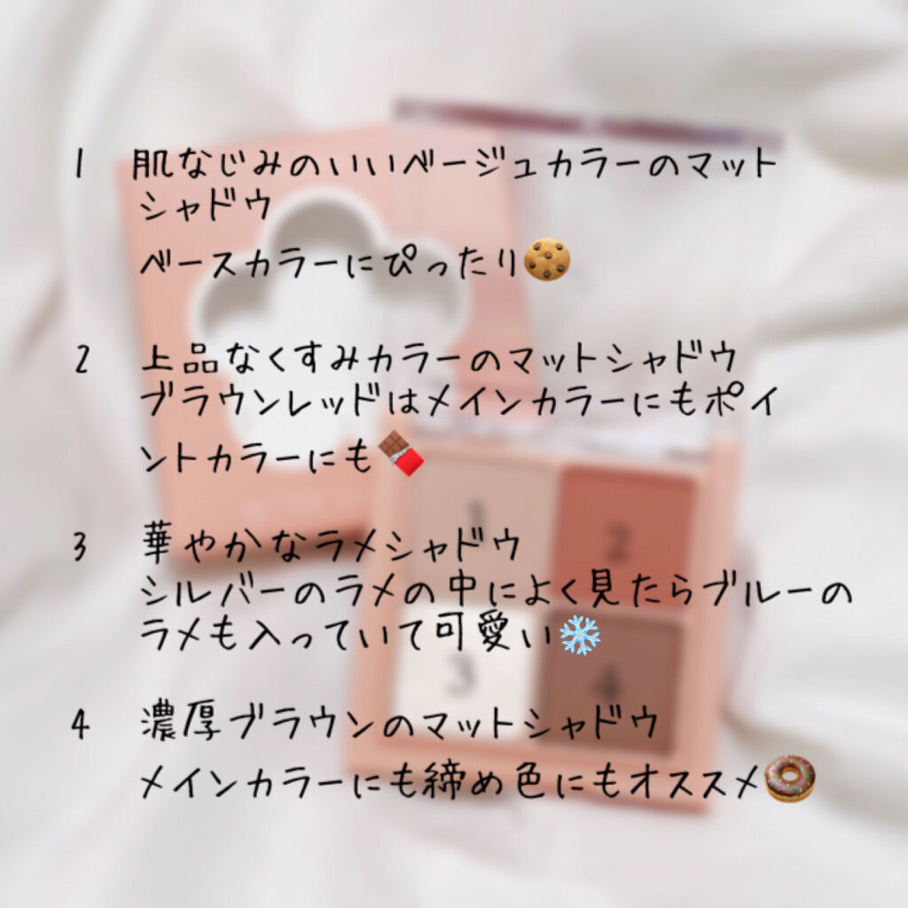 - 可愛いがあふれるドリームシャドウ ①肌に馴染みやすく使いやすい配色 ②クールメイクにピッタリな瞳を演出 ③なめらかで塗り心地の良いマットカラーが立体感を作る ④キラキラと輝く上品なまなざしを作るグリッター