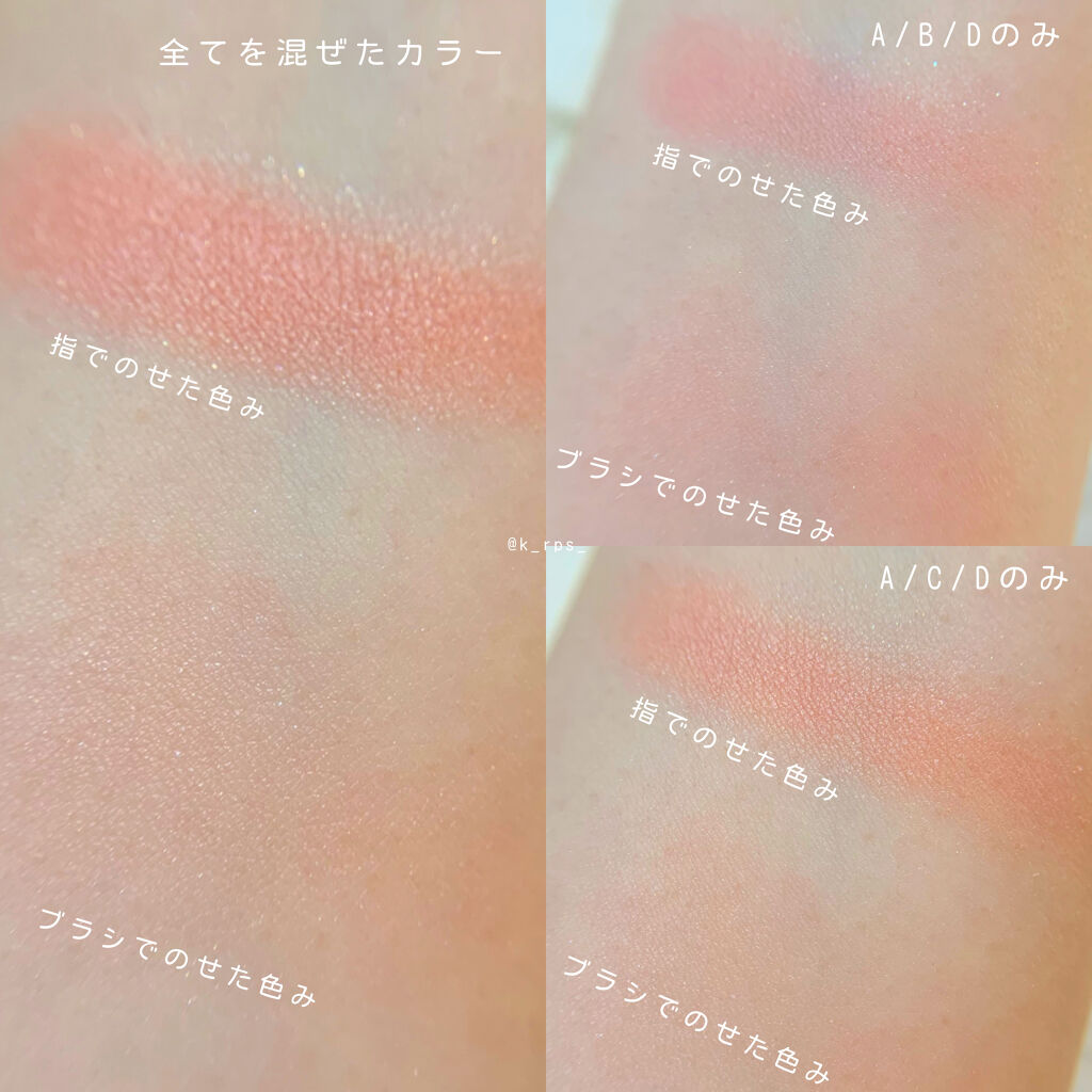 - しっとり「透けほわ」発色の4色チーク。 重ねても濁らず透明感が続き、自然なツヤ感で立体的な仕上がりになります。 混ぜても一色ずつでも、使い方自由自在。 オイルを配合することで、パウダーなのに肌に溶け込み密着するしっとりとした質感を実現しました。 左上のパールたっぷりのハイライトカラーや右下のマットなメインカラーを組み合わせて使用することで、自然な立体感がプラスされ、美肌印象がぐんとUP! 美容保湿成分(ヒアルロン酸Na、ソメイヨシノ葉エキス、ツバキ花エキス、水溶性コラーゲン)配合。