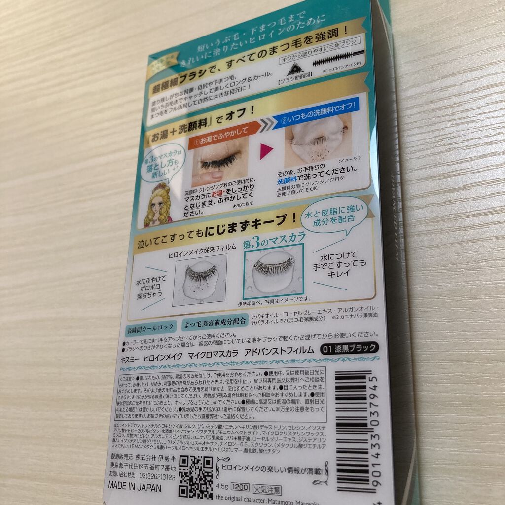 キスミーヒロインメイク マイクロマスカラアドバンストフィルム 01漆黒ブラック ¥1320初めて第3のマスカラを使ったかもしれない…。私はセルフまつ毛パーマ最近してるんですが、不器用な為あまり上手くカール出来てないんですが😅このマスカラで、ま...