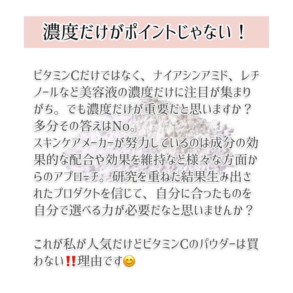 成分に固執していた時期もありましたが、今は使ってみた肌実感を何より大切にしています。 私の個人の感想を1つの意見としてみていただけると嬉しいです✨ 水溶性と油溶性のバランスがお肌の保護膜と近い7:3の保湿&エイジングケア美容液 ピュアビタミンC15%とビタミンE、フェルラ酸配合の本気のエイジングケア対策美容液 医薬部外品の言わずと知れた人気のビタミンC美容液 ビタミンCもビタミンC誘導体もグリセリンも含まれないさっぱりとしたブライトニングケアのプラセンタ美容液