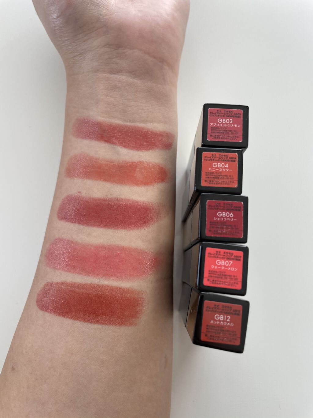 - <GB03 アプリコットシナモン> リンゴ酸ジイソステアリル、テトラエチルヘキサン酸ペンタエリスリチル、トリイソステアリン酸ポリグリセリル-2、水添ポリイソブテン、ヒドロキシアルキル(C16-18)ヒドロキシダイマージリノレイルエーテル、ワセリン、ポリエチレン、キャンデリラロウエステルズ、マイクロクリスタリンワックス、水添ポリデセン、アルガニアスピノサ核油、セラミドEOP、セラミドNG、セラミドNP、セラミドAP、水添レシチン、ダイズステロール、(HDI/トリメチロールヘキシルラクトン)クロスポリマー、カプリル酸グリセリル、トコフェロール、硫酸Ba、(+/-) シリカ、ラウロイルリシン、黄4、黄5、酸化チタン、酸化鉄、水酸化Al、青1、赤104(1)、赤201、赤202 <GB06 ショコラベリー> テトラエチルヘキサン酸ペンタエリスリチル、リンゴ酸ジイソステアリル、トリイソステアリン酸ポリグリセリル-2、水添ポリイソブテン、ヒドロキシアルキル(C16-18)ヒドロキシダイマージリノレイルエーテル、ワセリン、ポリエチレン、キャンデリラロウエステルズ、マイクロクリスタリンワックス、水添ポリデセン、アルガニアスピノサ核油、セラミドEOP、セラミドNG、セラミドNP、セラミドAP、水添レシチン、ダイズステロール、(HDI/トリメチロールヘキシルラクトン)クロスポリマー、カプリル酸グリセリル、トコフェロール、硫酸Ba、シリカ、ラウロイルリシン、黄4、黄5、酸化チタン、酸化鉄、水酸化Al、青1、赤201、赤202 <GB08 シークレットモカ> リンゴ酸ジイソステアリル、テトラエチルヘキサン酸ペンタエリスリチル、トリイソステアリン酸ポリグリセリル-2、水添ポリイソブテン、ヒドロキシアルキル(C16-18)ヒドロキシダイマージリノレイルエーテル、ワセリン、ポリエチレン、キャンデリラロウエステルズ、マイクロクリスタリンワックス、水添ポリデセン、アルガニアスピノサ核油、セラミドEOP、セラミドNG、セラミドNP、セラミドAP、(HDI/トリメチロールヘキシルラクトン)クロスポリマー、カプリル酸グリセリル、トコフェロール、フィトステロールズ、水添レシチン、硫酸Ba、(+/-) シリカ、ラウロイルリシン、黄4、黄5、酸化チタン、酸化鉄、水酸化Al、青1、赤104(1)、赤201、赤202 <GB09 セピアモーヴ> リンゴ酸ジイソステアリル、テトラエチルヘキサン酸ペンタエリスリチル、トリイソステアリン酸ポリグリセリル-2、水添ポリイソブテン、ヒドロキシアルキル(C16-18)ヒドロキシダイマージリノレイルエーテル、ワセリン、ポリエチレン、キャンデリラロウエステルズ、マイクロクリスタリンワックス、水添ポリデセン、アルガニアスピノサ核油、セラミドEOP、セラミドNG、セラミドNP、セラミドAP、(HDI/トリメチロールヘキシルラクトン)クロスポリマー、カプリル酸グリセリル、トコフェロール、フィトステロールズ、水添レシチン、硫酸Ba、(+/-) シリカ、ラウロイルリシン、黄4、黄5、酸化チタン、酸化鉄、水酸化Al、青1、赤104(1)、赤201、赤202 <GB11 ポメグラネイト> テトラエチルヘキサン酸ペンタエリスリチル、リンゴ酸ジイソステアリル、トリイソステアリン酸ポリグリセリル-2、水添ポリイソブテン、ヒドロキシアルキル(C16-18)ヒドロキシダイマージリノレイルエーテル、ワセリン、ポリエチレン、キャンデリラロウエステルズ、マイクロクリスタリンワックス、水添ポリデセン、アルガニアスピノサ核油、セラミドEOP、セラミドNG、セラミドNP、セラミドAP、(HDI/トリメチロールヘキシルラクトン)クロスポリマー、カプリル酸グリセリル、トコフェロール、フィトステロールズ、水添レシチン、硫酸Ba、(+/-) シリカ、ラウロイルリシン、黄4、黄5、酸化チタン、酸化鉄、水酸化Al、青1、赤201、赤202 <GB12 ホットカラメル> リンゴ酸ジイソステアリル、テトラエチルヘキサン酸ペンタエリスリチル、トリイソステアリン酸ポリグリセリル-2、水添ポリイソブテン、ヒドロキシアルキル(C16-18)ヒドロキシダイマージリノレイルエーテル、ワセリン、ポリエチレン、キャンデリラロウエステルズ、マイクロクリスタリンワックス、水添ポリデセン、アルガニアスピノサ核油、セラミドEOP、セラミドNG、セラミドNP、セラミドAP、(HDI/トリメチロールヘキシルラクトン)クロスポリマー、カプリル酸グリセリル、トコフェロール、フィトステロールズ、水添レシチン、硫酸Ba、(+/-) シリカ、ラウロイルリシン、黄4、黄5、酸化チタン、酸化鉄、水酸化Al、青1、赤104(1)、赤201、赤202 <GB01 レッドガーネット> リンゴ酸ジイソステアリル、テトラエチルヘキサン酸ペンタエリスリチル、トリイソステアリン酸ポリグリセリル-2、水添ポリイソブテン、ヒドロキシアルキル(C16-18)ヒドロキシダイマージリノレイルエーテル、ワセリン、ポリエチレン、キャンデリラロウエステルズ、マイクロクリスタリンワックス、水添ポリデセン、アルガニアスピノサ核油、セラミドEOP、セラミドNG、セラミドNP、セラミドAP、水添レシチン、ダイズステロール、(HDI/トリメチロールヘキ
