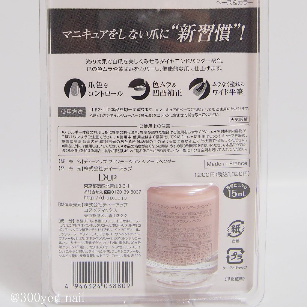 - <ヌードベージュ> 酢酸ブチル、酢酸エチル、ニトロセルロース、(アジピン酸・ネオペンチルグリコール・無水トリメリト酸)コポリマー、クエン酸アセチルトリブチル、イソプロパノール、ステアラルコニウムヘクトライト、(アジピン酸・フマル酸・トリシクロデカンジメタノール)コポリマー、ポリメチルシルセスキオキサン、オキシベンゾン-1、酸化チタン、クエン酸、酸化鉄、黄4、ダイヤモンド末 <ナチュラルピンク> 酢酸ブチル、酢酸エチル、ニトロセルロース、(アジピン酸/ネオペンチルグリコール/無水トリメリト酸)コポリマー、クエン酸アセチルトリブチル、イソプロパノール、アクリレーツコポリマー、ステアラルコニウムベントナイト、ブタノール、オキシベンゾン-1、シリカ、ジアセトンアルコール、ヘキサナール、水、リン酸、加水分解ケラチン、酸化チタン、赤201、黄4、アセチルメチオニン、アセチルシステイン、ダイヤモンド末、パントテン酸Ca、フェノキシエタノール、ソルビン酸K、安息香酸Na <シアーラベンダー> 酢酸ブチル、酢酸エチル、ニトロセルロース、(アジピン酸/ネオペンチレングリコール/無水トリメリト酸)コポリマー、クエン酸アセチルトリブチル、イソプロパノール、アクリレーツコポリマー、ステアラルコニウムベントナイト、ブタノール、シリカ、オキシベンゾン-1、ジアセトンアルコール、ヘキサナール、酸化チタン、水、リン酸、酸化鉄、加水分解ケラチン(羊毛)、アセチルメチオニン、アセチルシステイン、パントテン酸Ca、ダイヤモンド末、フェノキシエタノール、ソルビン酸K、安息香酸Na、トコフェロール、黄4、赤220 <ピュアミルク> 酢酸ブチル、酢酸エチル、ニトロセルロース、(アジピン酸/ネオペンチレングリコール/無水トリメリト酸)コポリマー、クエン酸アセチルトリブチル、イソプロパノール、アクリレーツコポリマー、ステアラルコニウムベントナイト、ブタノール、シリカ、オキシベンゾン-1、ジアセトンアルコール、ヘキサナール、水、リン酸、酸化鉄、加水分解ケラチン(羊毛)、酸化チタン、アセチルメチオニン、アセチルシステイン、パントテン酸Ca、ダイヤモンド末、フェノキシエタノール、ソルビン酸K、安息香酸Na、トコフェロール、黄4