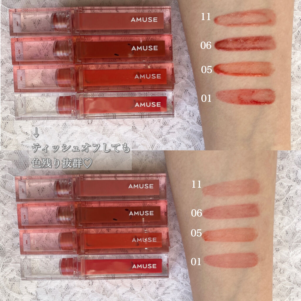 - <01 ラヴィアンコーラル> 精製水、ジフェニルジメチコン、リンゴ酸ジイソステアリル、ビスジグリセリルポリアシルアジペート-2、水添ポリイソブテン、ジグリセリン、セチルPEG/PPG-10/1ダイメチコン、DPG、イソステアリン酸ソルビタン、ポリソルベート60、オクチルドデカノール、ペンチレングリコール、グリセリン、二酸化チタン、セテアレス-20、アクリル酸ヒドロキシエチル/ナトリウムアクリロイルジメチルタウリン酸共重合体フェノキシエタノール、スクアラン、ポリグリセリン-3、香料、ステビオシド、黄色4号、エチルヘキシルグリセリン、赤色227号、トリ(カプリル/カプリン酸)グリセリル、赤色104号(1)、トコフェリルアセテート、黄色5 号、ブリリアントブルーFCF、マンゴー果実エキス、リンゴエキス <06 フィグデュー> 水、ジフェニルジメチコン、リンゴ酸ジイソステアリル、ポリアシルアジピン酸ビス-ジグリセリル-2、水添ポリイソブテン、ジグリセリン、セチルPEG/PPG-10/1ジメチコン、ジプロピレングリコール、イソステアリン酸ソルビタン、ポリソルベート60、オクチルドデカノール、ペンチレングリコール、グリセリン、二酸化チタン(CI) 77891)、セテアレス-20、アクリル酸ヒドロキシエチル/アクリロイルジメチルタウリンナトリウムコポリマー、スクワラン、フェノキシエタノール、ポリグリセリン-3、香料、ステビオシド、赤28(CI 45410)、黄6(CI 15985)、黄5(CI 19140)、エチルヘキシルグリセリン、レッド 33 (CI 17200)、カプリル酸/カプリン酸トリグリセリド、酢酸トコフェロール、ブルー 1 (CI 42090)、Mangifera Indica (マンゴー) 果実エキス、Pyrus Malus (リンゴ) 果実エキス <12 日曜日> 水、ジフェニルジメチコン、リンゴ酸ジイソステアリル、ビスジグリセリルポリアシルアジペート-2、水添ポリイソブテン、ジグリセリン、セチルPEG/PPG-10/1ジメチコン、DPG、イソステアリン酸ソルビタン、ポリソルベート60、オクチルドデカノール、ペンチレングリコール、グリセリン、セテアレス-20、(アクリル酸ヒドロキシエチル/アクリロイルジメチルタウリンNa)コポリマー、フェノキシエタノール、スクワラン、ポリグリセリン-3、ステビオシド、香料、エチルヘキシルグリセリン、トリ(カプリル酸/カプリン酸)グリセリル、酢酸トコフェロール、マンゴー果実エキス、リンゴ果実エキス、酸化チタン、酸化鉄、黄4、赤227、赤104(1)、黄5、青1 <【旧】02 漢江ブリーズ> 水、ジフェニルジメチコン、リンゴ酸ジイソステアリル、ポリアシルアジピン酸ビス-ジグリセリル-2、水添ポリイソブテン、ジグリセリン、セチルPEG/PPG-10/1ジメチコン、ジプロピレングリコール、イソステアリン酸ソルビタン、ポリソルベート60、オクチルドデカノール、ペンチレングリコール、グリセリン、二酸化チタン(CI) 77891)、セテアレス-20、アクリル酸ヒドロキシエチル/アクリロイルジメチルタウリンナトリウムコポリマー、フェノキシエタノール、スクワラン、イエロー6 (CI 15985)、ポリグリセリン-3、香料、ステビオシド、エチルヘキシルグリセリン、レッド33 (CI 17200)、レッド28 (CI 45410)、トリカプリル/カプリン酸グリセリド、酢酸トコフェロール、ブルー 1 (CI 42090)、Mangifera Indica (マンゴー) 果実エキス、Pyrus Malus (リンゴ) 果実エキス <【旧】05 ヒップジロー> 水、ジフェニルジメチコン、リンゴ酸ジイソステアリル、ポリアシルアジピン酸ビス-ジグリセリル-2、水添ポリイソブテン、ジグリセリン、セチルPEG/PPG-10/1ジメチコン、ジプロピレングリコール、イソステアリン酸ソルビタン、ポリソルベート60、オクチルドデカノール、ペンチレングリコール、グリセリン、二酸化チタン(CI) 77891)、セテアレス-20、アクリル酸ヒドロキシエチル/アクリロイルジメチルタウリンナトリウムコポリマー、スクワラン、フェノキシエタノール、イエロー6 (CI 15985)、ポリグリセリン-3、香料、ステビオシド、エチルヘキシルグリセリン、レッド33 (CI 17200)、カプリル酸/カプリン酸トリグリセリド、酢酸トコフェロール、ブルー 1 (CI 42090)、Mangifera Indica (マンゴー) 果実エキス、Pyrus Malus (リンゴ) 果実エキス <【旧】09 ソウル ソウル> 水、ジフェニルジメチコン、マレートジソステアル、ビスジグリセリルポリシルダイピン-2、水素化ポリイソブテン、ディグリセリン、セチルペグ/PPG-10/1ジメチコン、ジップロピレングリコール、ソルビトン等酸塩、ポリソルベ酸60、オクティロドデドカン、ペンシェルン、ペントリン酸塩、ペントリ酸塩、ペンシュレン 二酸化チタン (CI 77891)、アクリル酸ヒドロキシエチル/アクリロイルジメチルタウリン酸ナトリウムコポリマー、フェノキシエタノール、スクワラン、イエロー6 (CI 15985)、ポリグリセリン-3、香料、ステビオシド、エチルヘキシルグリセリン、レッド33 (CI 17200)、カプリル酸/カプリン酸トリグリセリド、酢酸トコフェロール、ブルー 1 (CI 42090)、Mangifera Indica (マンゴー) 果実エキス、Pyrus Malus (リンゴ) 果実エキス <【旧】10 朝イチジク> 水、ジフェニルジメ