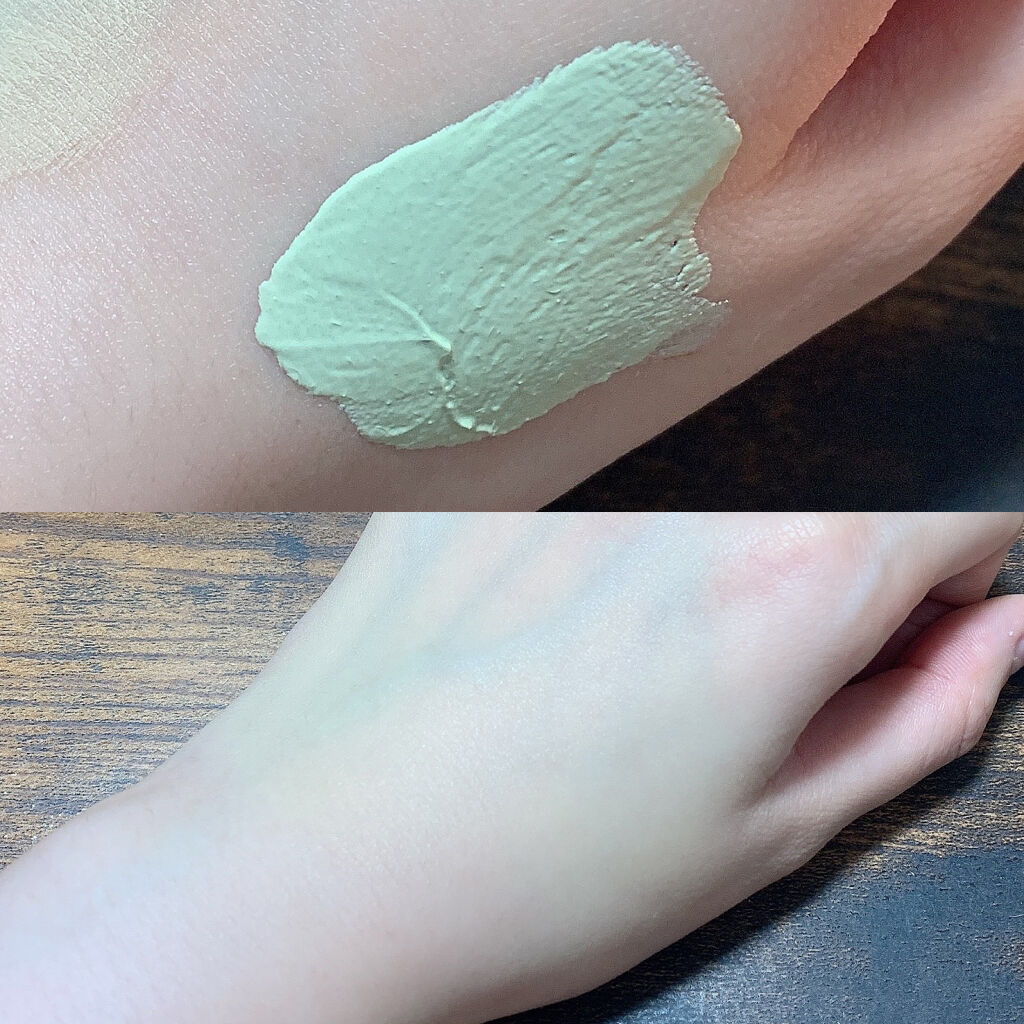- 赤みをきちんとカバーするスキンケア兼用下地。緑色のクリームが肌でベージュ色に変化し、ニキビ跡やくすみをカバーします。