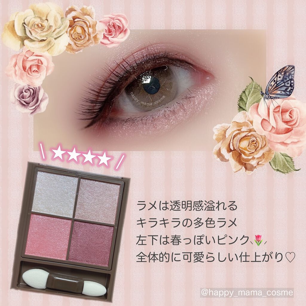 溶け合う色とパールで上品にツヤめく目元へ✨️ 🟠美容保湿成分(スクワラン・オリーブ果実油・ホホバ種子油・マカデミア種子油・カニナバラ果実油)配合 コーラルだけどピンクが黄み過ぎないからわりとニュートラルに使えるかも👍️ ラメ感はまあまあ強めですがブラウンがメインなのでお仕事メイクとかにも向いてると思います⭕️ ダイヤ模様のパケも可愛い🔶 メインを変えて2色でも4色使っても組み合わせ次第で異なるニュアンスに仕上がります〜