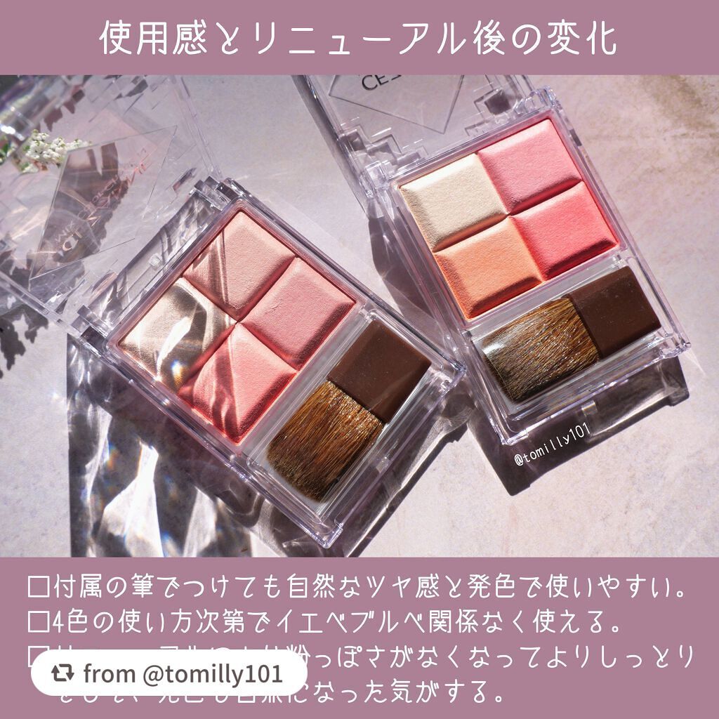 - しっとり「透けほわ」発色の4色チーク。 重ねても濁らず透明感が続き、自然なツヤ感で立体的な仕上がりになります。 混ぜても一色ずつでも、使い方自由自在。 オイルを配合することで、パウダーなのに肌に溶け込み密着するしっとりとした質感を実現しました。 左上のパールたっぷりのハイライトカラーや右下のマットなメインカラーを組み合わせて使用することで、自然な立体感がプラスされ、美肌印象がぐんとUP! 美容保湿成分(ヒアルロン酸Na、ソメイヨシノ葉エキス、ツバキ花エキス、水溶性コラーゲン)配合。