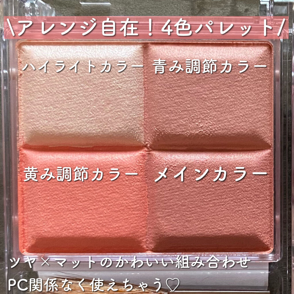 - しっとり「透けほわ」発色の4色チーク。 重ねても濁らず透明感が続き、自然なツヤ感で立体的な仕上がりになります。 混ぜても一色ずつでも、使い方自由自在。 オイルを配合することで、パウダーなのに肌に溶け込み密着するしっとりとした質感を実現しました。 左上のパールたっぷりのハイライトカラーや右下のマットなメインカラーを組み合わせて使用することで、自然な立体感がプラスされ、美肌印象がぐんとUP! 美容保湿成分(ヒアルロン酸Na、ソメイヨシノ葉エキス、ツバキ花エキス、水溶性コラーゲン)配合。
