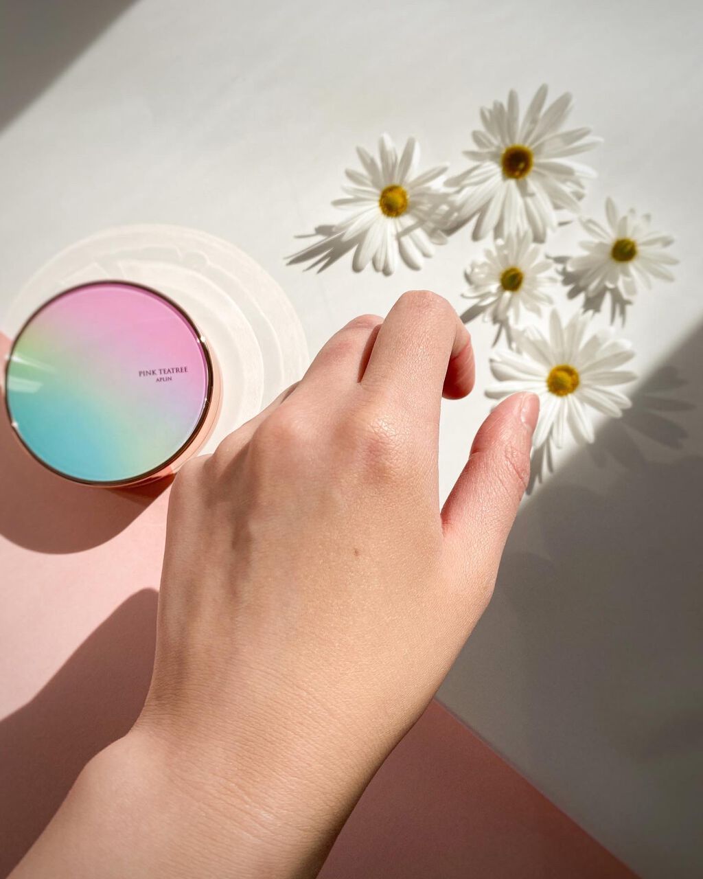 APLIN(アプリン)のピンクティーツリーカバークッション🧸🌷ティーツリー葉エキス🌿やツボクサエキスなど美容成分が配合されたクッションファンデで、ピンク×水色のグラデが目を引く可愛いパッケージでテンショ...