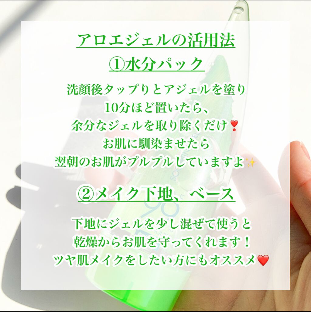 - アロエ99%のボタニカル美容ジェル。 済州島原産の良質なアロエを厳選し、贅沢に99%使用しています。 潤いを与えつつ、べたつかないサラッとした使用感が特徴です。 さわやかな香りつきと日本限定の無香料の2種類からお選びいただけます。 《様々な使い方》 アフターシェーブ・・・カミソリ後の肌へ適量を塗り伸ばし馴染ませます。 ヘアエッセンス・・・ダメージのひどい毛先に伸ばして塗ります。 アイパック・・・コットンに冷蔵庫で冷やした冷たいスージングジェルを含ませ、目の上に乗せます。 日焼け後・・・ジェルを適量とり体に伸ばして塗ります。 全身美容液・・・素早くなじむ浸透力*!みずみずしく潤い保湿します。*角質層まで