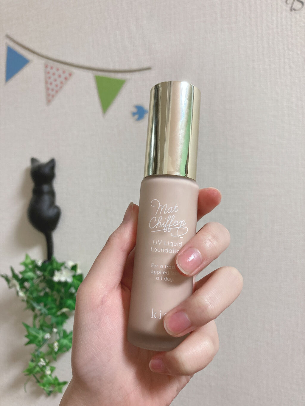 kiss キスマットシフォンUVリキッドファンデ01ライトピンクオークルSPF25/PA++やや重ためなガラスボトルのプッシュタイプ手の甲に出した後傾けても垂れない少し固めのテクスチャ仕上がりはセミマット展開カラーの中では唯一のピンク系だけど...
