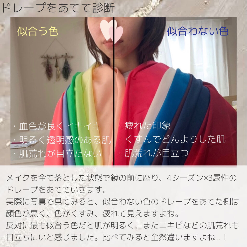 ピンポイントで自分に一番似合う色味を知ることができるので、イエベ・ブルベだけではしっくりこなかった方、いわゆる「グリーンベース」と呼ばれる方にもおすすめ。