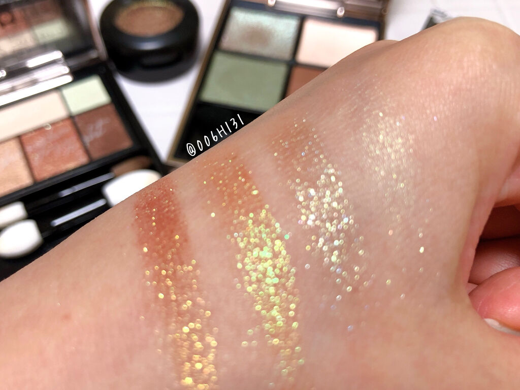 最終的にちょっとギャルみが出たかな?😂グリーンみゴールドを主役に、ゴールド、オレンジ、ヌードリップを組み合わせたよ🥰💕アイメイクはグリーンゴールドが主役😍✨ギラギララメを多めにチョイスしたから華やかな仕上がり❣️だけど、女神スポットと目頭に使...