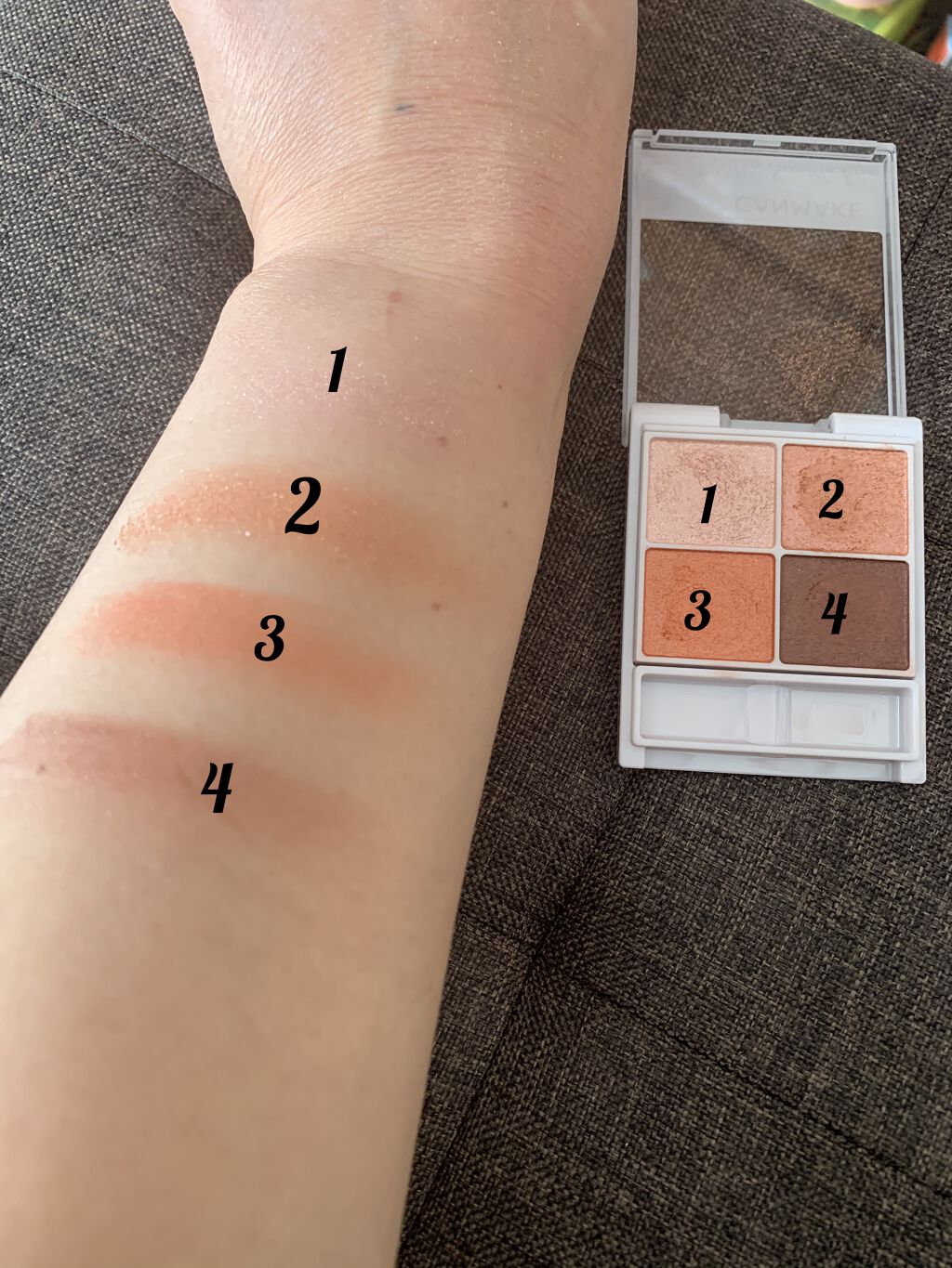 粉質も良く、しっとりしていて、粉飛びも気にならなかったです。 上段の左がオレンジマットで、猫ちゃんの絵が彫られててかわいいです。オレンジがビダミンカラーでかわいい😍 上段の右がラメになっています。しっとりしていて良かったです。仕事にしていくのは、難しいですが、オフの日に付けて、テンションが上がっていいです☺️ 下段の左はピンクのマットにラメがチラチラ入っています。 下段の右は赤にピンクぽさがある、マットにラメがチラチラ入ってます。下段は多色ラメでかわいいです。 上段はイエベさんに合いそう、下段はブルベさんに合いそう、 イエベさんは上段を主に使いながら、ポイントや上段と下段を混ぜたり使い方がたくさんあるパレットだと思います。 ブルベさんは下段を主に使って、上段をポイントに使う感じがいいと思います。 メイクが楽しくなる、かわいいアイシャドウだなと思いました。 イエベさんにも、ブルベさんにもオススメです。