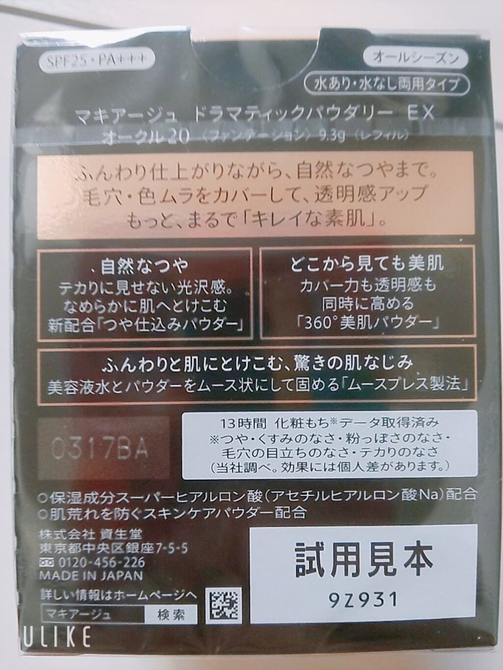 - ふんわりなのに自然なつや。ムース生まれのパウダリー ふんわり仕上がりながら、自然なつやまで。驚きの肌なじみで、毛穴・色ムラをカバーして、透明感アップ。 どこからみても美しい、まるで「キレイな素肌」へ。 オールシーズン。水あり・水なし両用タイプ。SPF25・PA+++。 やわらかフィットスポンジ付き。 13時間 化粧もち*データ取得済み *つや・くすみのなさ・粉っぽさのなさ・毛穴の目立たなさ・テカりのなさ(資生堂調べ。効果には個人差があります。)