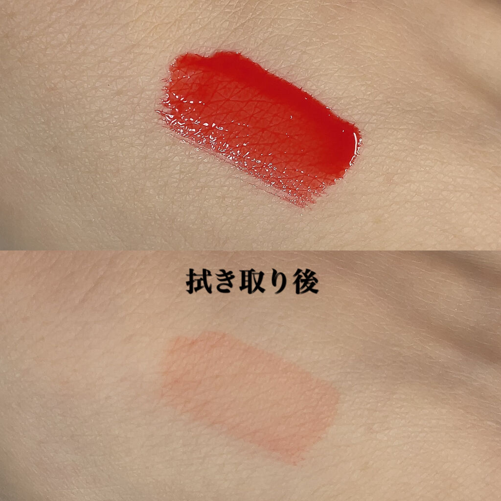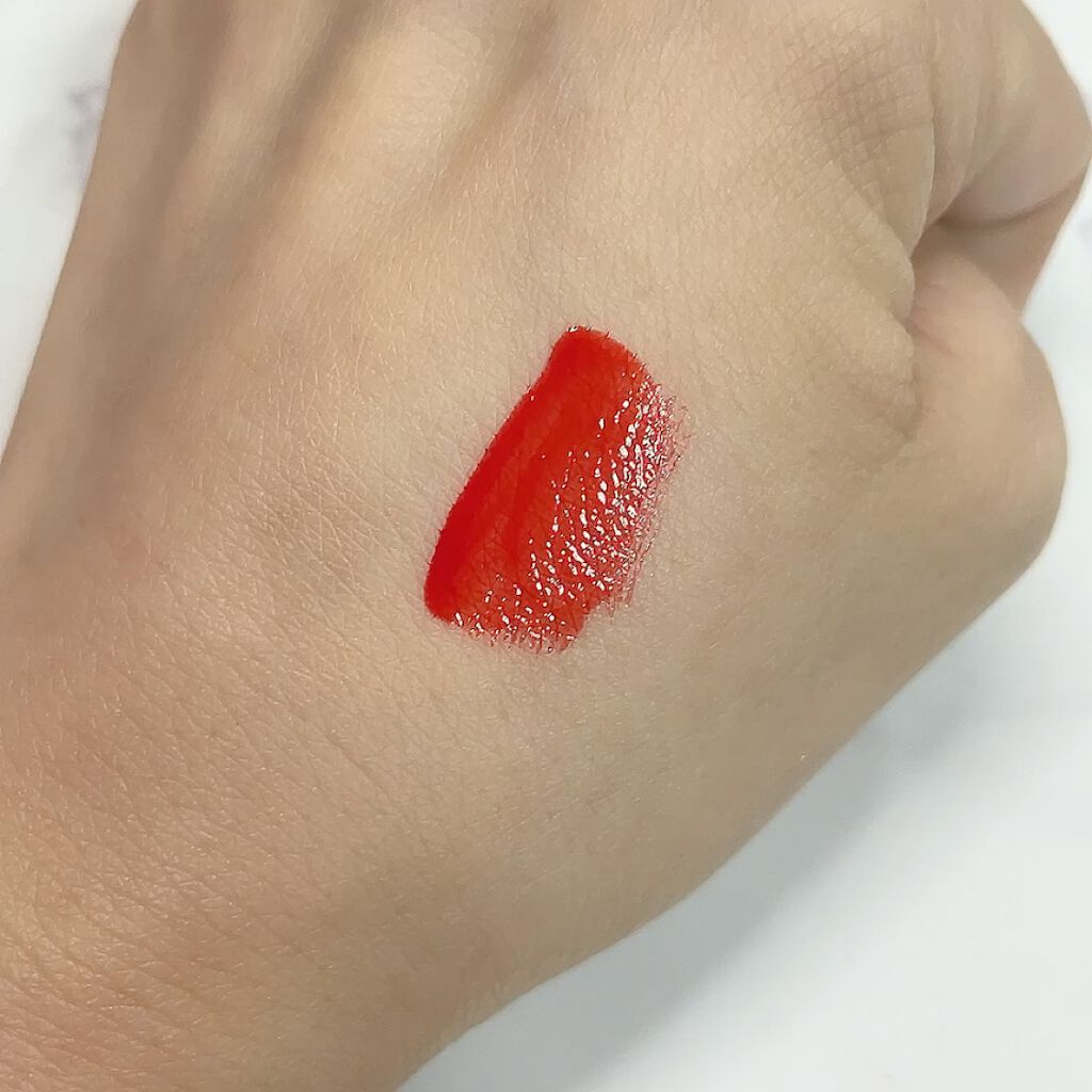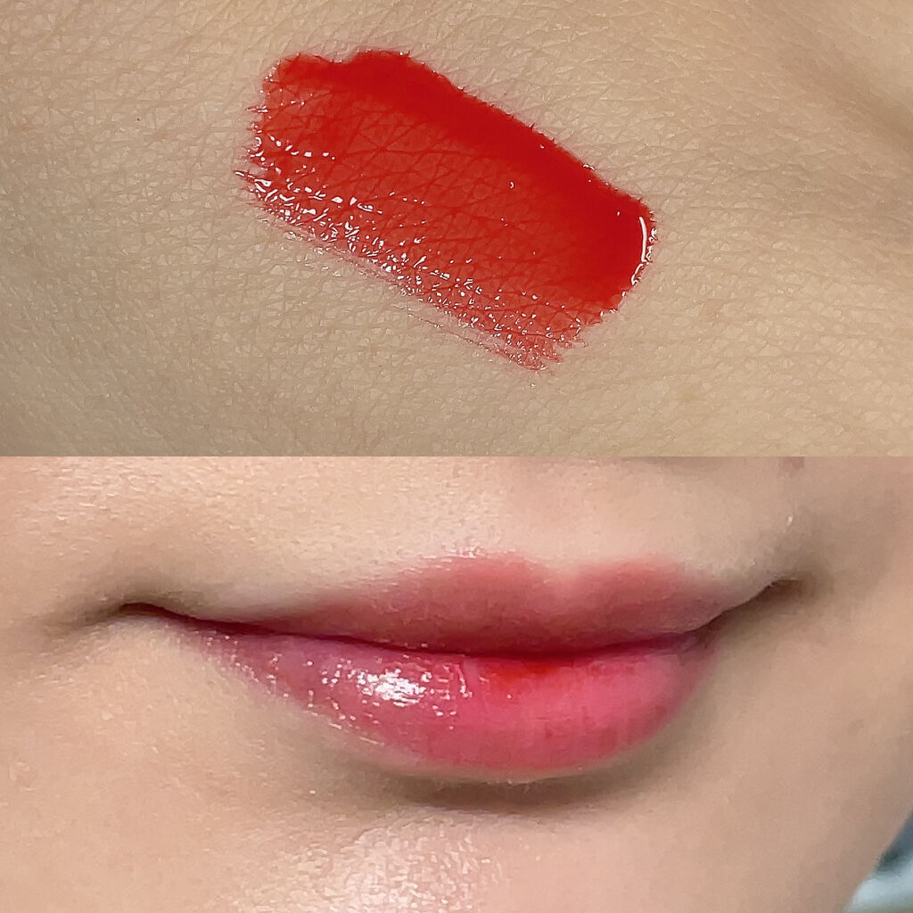 メルティングデューイティントは発色のよいティントで夏におすすめのティントです🙌 #03 Hibiscus Teaのカラーはオレンジ味の強いレッドカラーで夏につけるのが👌 メルティングデューイティントのアプリケーターは唇に沿うようなかたちで塗りやすいですが、大きめなので細かいところは塗りにくいかもです。 液がさらさらとしているので塗りやすいですが、ツヤもあるようなないような……🤔? マットではないですが、ぷるっとした感じにもならない感じです。(表現が難しい😇) ティント効果は結構しっかりしていて濃いめに残るので塗る時は注意です!
