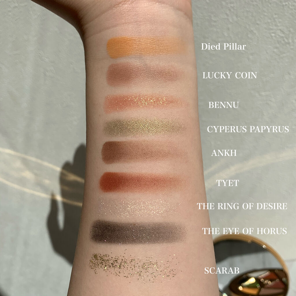 - 夜空に輝く満天の星はすべてあなたのもの。 正義の女神(目隠しした女神)からインスピレーションを得ています。 自由を享受し、美しさを伝えます。 四つ葉のクローパーが幸運を運んでくれるよう願い、 守護女神のイメージを打ち出しています。9色のカラーはあなたを守る9つの運勢を表します。01知恵の女神は、トレンドカラーのイエローグリーン系カラーを配色。リッチなツヤ感のあるグレー系グリーンと特徴的なフォレストグリーンを採用し、独特なニュアンスを演出します。 合わせやすいオレンジブラウン系カラーを配色しているため、単色でも普段のメイクがより魅力的な仕上がりに。またイエローグリーン系カラーと合わせると、いつもとは違ったアイメイク効果が得られます。02勝利の女神のパレットには濡れ感のあるブルーバパープルカラーのダイヤモンドラメアイシャドウを中心に、他に7色の大粒ラメ小粒ラメ入りアイシャドウをセット。2種類のイエローグリーン系カラー、 ヘーゼルグリーン系カラー、そしてピビビットな暖色のバパープルピンク系カラーを揃えました。小粒ラメ、大粒ラメ、ダイヤモンドラメのどれをとってもメイクに繊細な効果をプラスします。大胆でありながらも大げさにならないカラーは、普段のメイクにも、遊び心を加えたい時にもびったりで実用性に優れています。