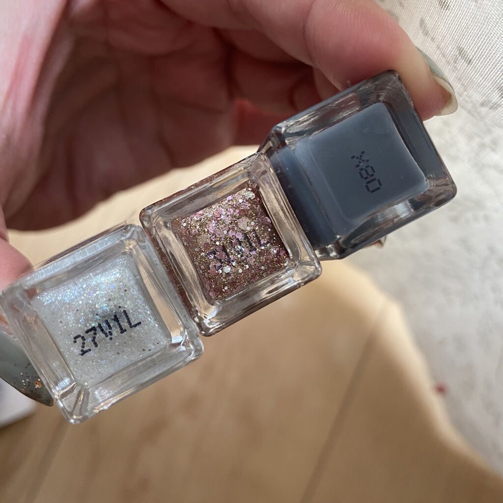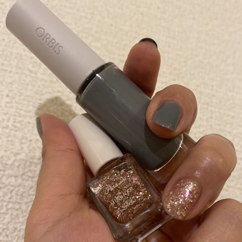 カラフルで気分の上がるデザインと、波打ち際をイメージしたデザインの2種類を作製しました。 全体がキラキラして、より夏の日差しに映えます✨シャイニーオリオンは大好きでストックを3本持っています🫶 ドリーミングバブルのホロが輝く水面のよう✨人差し指と小指に使用したGD01 スパークルシーは使い勝手抜群!