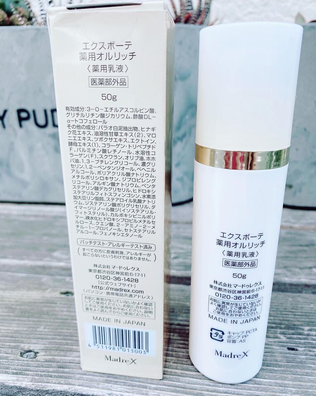 エクスボーテ薬用オルリッチ(薬用乳液)医薬部外品50gこの薬用オルリッチは、化粧液・美容液・乳液・クリームがひとつになった薬用美白オールインワン乳液になります☺️✨✅シミを防ぐVCエチル✅肌荒れ・ニキビを防ぐグリチルリチン酸ジカリウム・酢酸ト...