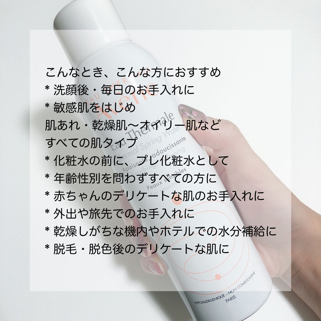 - 肌にいい水、アベンヌ温泉水100%。 肌をやわらげ、みずみずしくなめらかにし、敏感な肌をやさしく落ちつかせます。 使いやすいスプレータイプの化粧水。 ~こんなとき、こんな方におすすめ~ ●洗顔後・毎日のお手入れに ●敏感肌をはじめ肌あれ・乾燥肌~オイリー肌など、すべての肌タイプ ●化粧水の前に、プレ化粧水として ●年齢性別を問わずすべての方に ●赤ちゃん(生後3ヵ月~)のデリケートな肌のお手入れに ●外出や旅先でのお手入れに ●乾燥しがちな機内やホテルでの水分補給に ●脱毛・脱色後のデリケートな肌に 無菌室製造/無香料/無着色/アルコール(エタノール)フリー/防腐剤フリー/アレルギーテスト・パッチテスト・ノンコメドジェニックテスト済み ※すべての方にアレルギーや皮ふ刺激がおきない、また、ニキビができないわけではありません。 ※2024年9月より順次パッケージリニューアル