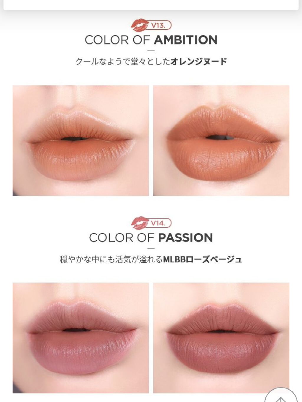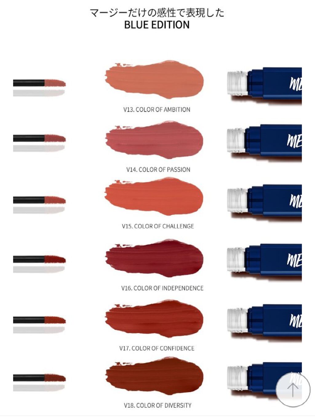 - V1. ブラッディマリー:精製水, ジメチコン,トリイソステアリン酸ポリグリセリル-2,マイカ,イソドデカン,グリセリン,(ジメチコン /ビニルジメチコン)クロスポリマー,シリカ,ペンチレングリコール,シクロペンタシロキサン,トリメチル シロキシケイ酸,酸化チタン(IV),(ジメチコン/ビニルジメチコン)クロスポリマー,セチルPEG/PPG-1 0/1ジメチコン,赤色218号,赤色102号,酸化鉄,1,2-ヘキサンジオール,橙色205号,1,3-ブタンジオール ,シクロテトラシロキサン,メチコン,ステビオシド,イソセテス-20,青1,シアバター(シア脂),マカデミアナ ッツ油,トコフェロール酢酸エステル,ダイウイキョウ果実エキス,オウゴン根エキス,ローズマリー油,香料 V2. ジャックローズ:精製水, ジメチコン,マイカ,トリイソステアリン酸ポリグリセリル-2,イソドデカン,グリセリン,(ジメチコン /ビニルジメチコン)クロスポリマー,シリカ,酸化チタン(IV),ペンチレングリコール,シクロペンタシロキ サン,トリメチルシロキシケイ酸,(ジメチコン/ビニルジメチコン)クロスポリマー,セチルPEG/PPG-1 0/1ジメチコン,黒酸化鉄,赤色218号, 1,2-ヘキサンジオール,1,3-ブタンジオール,シクロテトラシロ キサン,青1,メチコン,ステビオシド,イソセテス-20,シアバター(シア脂),マカデミアナッツ油,酢酸 DL-α- トコフェロール,ダイウイキョウ果実エキス,オウゴン根エキス,ローズマリー油,香料 V3. カシスオレンジ:精製水, ジメチコン,マイカ,トリイソステアリン酸ポリグリセリル-2,イソドデカン,グリセリン,ジメチコン クロスポリマー,シリカ,ペンチレングリコール,酸化チタン(IV),シクロペンタシロキサン,トリメチルシロキ シケイ酸,(ジメチコン/ビニルジメチコン)クロスポリマー,セチルPEG/PPG-10/1ジメチコン,酸化 鉄,1,2-ヘキサンジオール,橙色205号,黄5,赤202,1,3-ブチレングリコール,シクロテトラシロキサン,メ チコン,ステビオシド,イソセテス-20,青1,シアバター(シア脂),マカデミアナッツ油,トコフェロール酢酸 エステル,ダイウイキョウ果実エキス,オウゴン根エキス,ローズマリー油,香料 V4. シャーリーテンプル:精製水, ジメチコン,マイカ,トリイソステアリン酸ポリグリセリル-2,イソドデカン,グリセリン,ジメチコン クロスポリマー,シリカ,ペンチレングリコール,シクロペンタシロキサン,トリメチルシロキシケイ酸,(ジメ チコン/ビニルジメチコン)クロスポリマー,セチルPEG/PPG-10/1ジメチコン,酸化鉄,酸化チタン(I V),赤202,1,2-ヘキサンジオール,黄5,橙色205号,1,3-ブタンジオール,シクロテトラシロキサン,メチコン ,ステビオシド,イソセテス-20,赤色218号,青1,シアバター(シア脂),マカデミアナッツ油,トコフェロール 酢酸エステル,ダイウイキョウ果実エキス,オウゴン根エキス,ローズマリー油,香料 V5. ピーチクラッシュ:精製水, ジメチコン,マイカ,トリイソステアリン酸ポリグリセリル-2,イソドデカン,グリセリン,ジメチコン クロスポリマー,シリカ,ペンチレングリコール,シクロペンタシロキサン,トリメチルシロキシケイ酸,酸化 チタン(IV),(ジメチコン/ビニルジメチコン)クロスポリマー,セチルPEG/PPG-10/1ジメチコン,酸化 鉄,赤202,赤色102号,1,2-ヘキサンジオール,1,3-ブタンジオール,シクロテトラシロキサン,メチコン,赤 色218号,ステビオシド,イソセテス-20,青1,シアバター(シア脂),マカデミアナッツ油,トコフェロール酢 酸エステル,ダイウイキョウ果実エキス,オウゴン根エキス,ローズマリー油,香料 V6. フィレンツェネグローニ:精製水, ジメチコン,マイカ,トリイソステアリン酸ポリグリセリル-2,イソドデカン,グリセリン,ジメチコン クロスポリマー,シリカ,ペンチレングリコール,シクロペンタシロキサン,トリメチルシロキシケイ酸,(ジメ チコン/ビニルジメチコン)クロスポリマー,セチルPEG/PPG-10/1ジメチコン,赤色102号,赤202,1, 2-ヘキサンジオール,橙色205号,1,3-ブタンジオール,シクロテトラシロキサン,メチコン,赤色218号,ス テビオシド,イソセテス-20,青1,シアバター(シア脂),マカデミアナッツ油,トコフェロール酢酸エステル, ダイウイキョウ果実エキス,オウゴン根エキス,ローズマリー油,香料