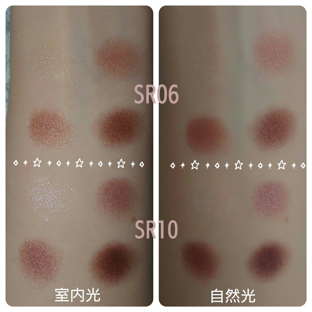 ~アイシャドウ比較~ブルーベースにオススメと言われているSR06とSR10を購入してみました!🌸SR06センシュアルブラウン…少し黄みを感じるピンクブラウンで、全体的にゴールドのラメが入っています。ブルーベースの方はSR10の方がお似合いなの...