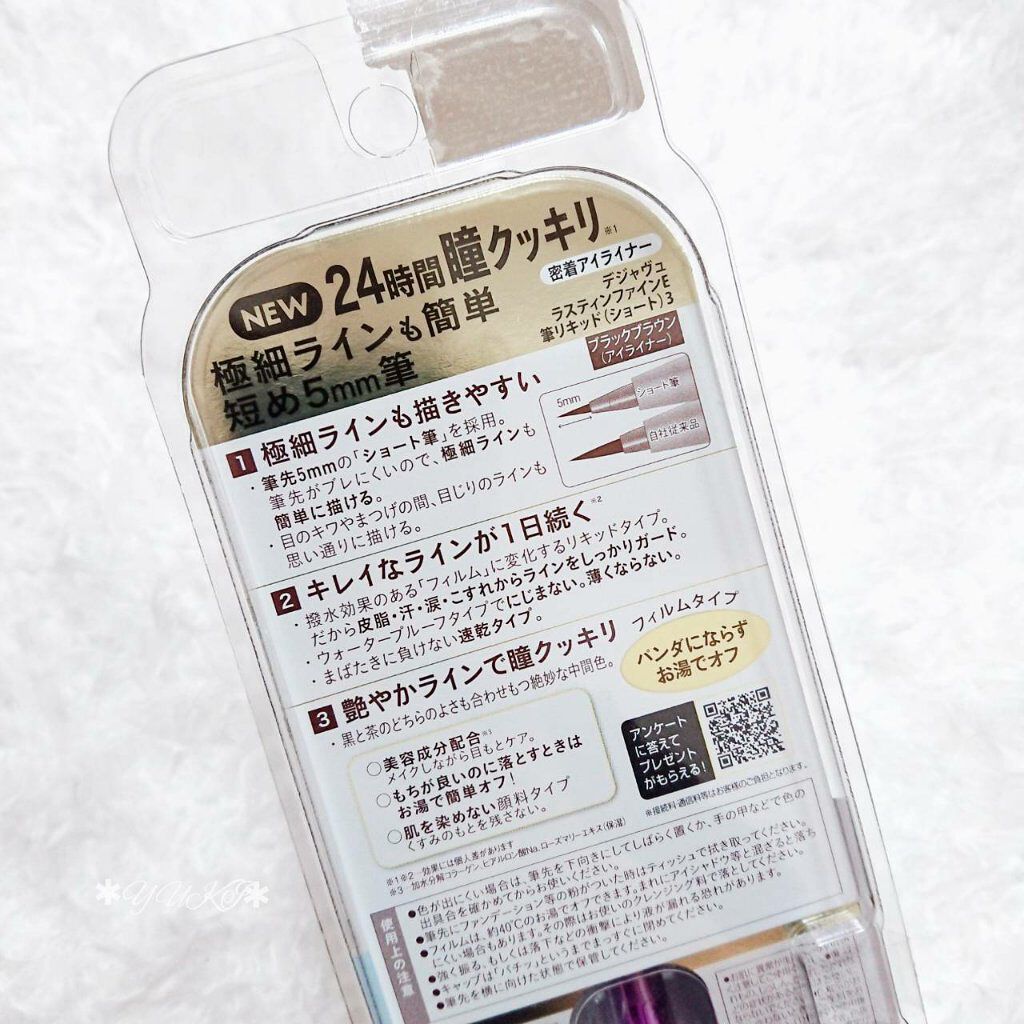 - 極細ラインも描きやすい 短め5㎜のリキッドアイライナー ・筆先5㎜のショート筆を採用。筆先が安定してブレにくく、極細ラインも簡単に描けます。 ・ラインキープ剤を高配合しているので、皮脂・汗・こすれからラインをしっかりガード。 ・もちが良いのに、お湯で落とせるフィルムタイプ。