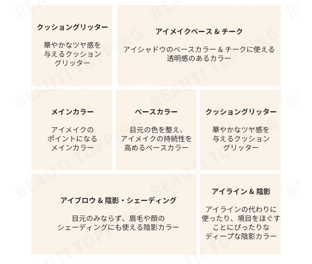 - デイリーカラーからまばゆいグリッターまで簡単にトレンド顔を叶える捨て色なしのアイシャドウパレット。 アイシャドウはもちろん、チークやシェーディング、アイブロウにもマルチに使える。